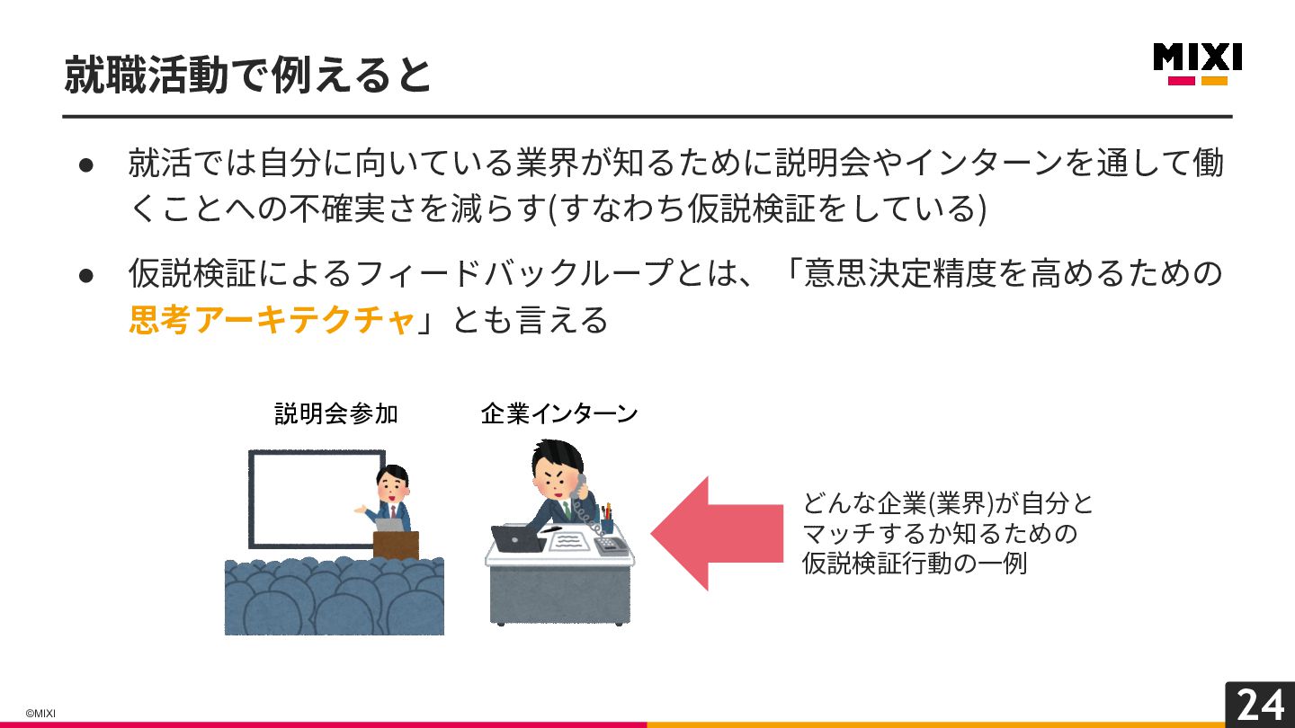 24 ©MIXI • 就活では⾃分に向いている業界が知るために説明会やインターンを通して働 くことへの不確実さを減らす(すなわち仮説検証をしている) • 仮説検証によるフィードバックループとは、「意思決定精度を⾼めるための 思考アーキテクチャ」とも⾔える 就職活動で例えると 説明会参加