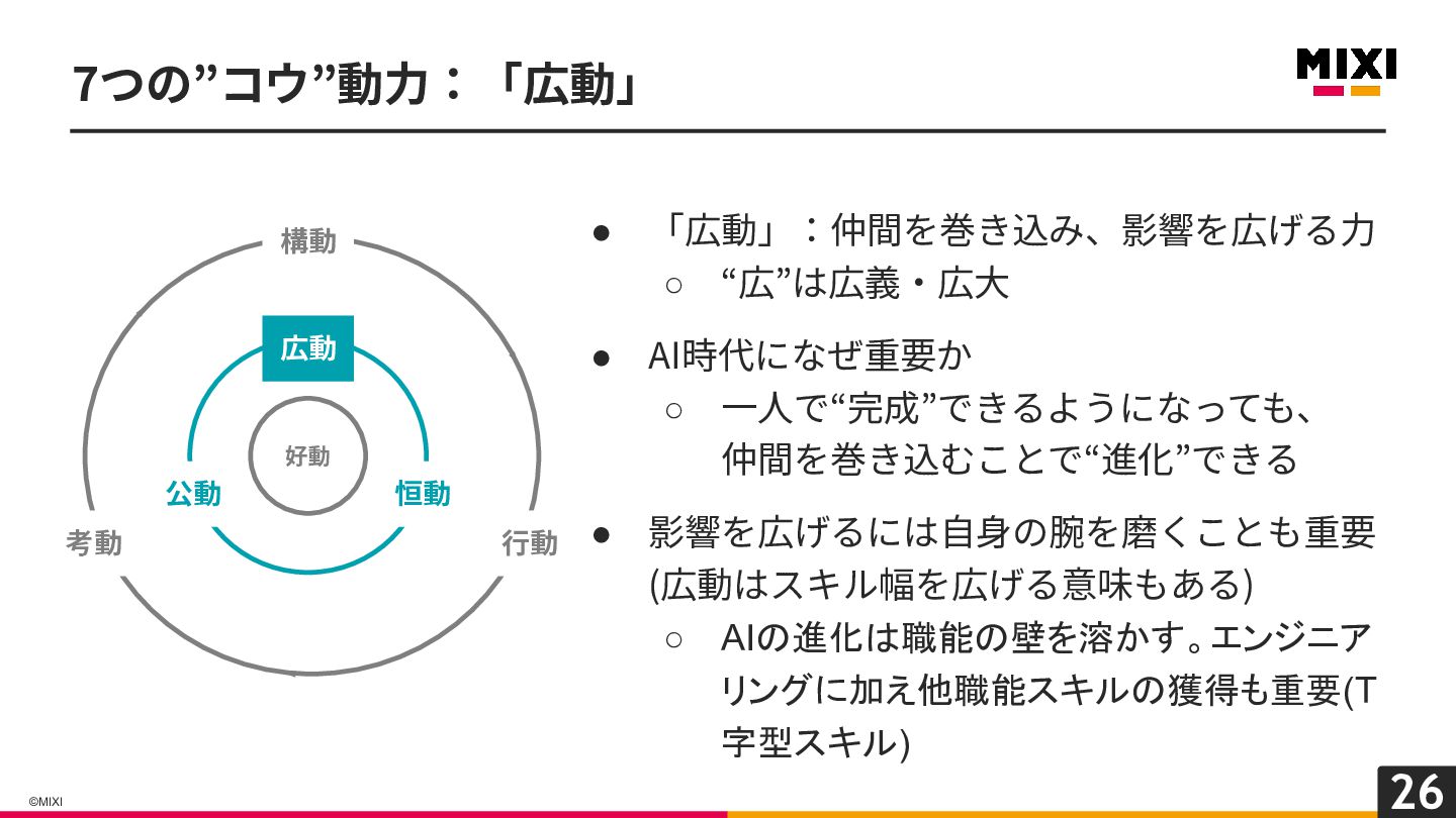 26 ©MIXI 7つの”コウ”動⼒:「広動」 • 「広動」:仲間を巻き込み、影響を広げる⼒ ◦ “広”は広義‧広⼤ • AI時代になぜ重要か ◦
