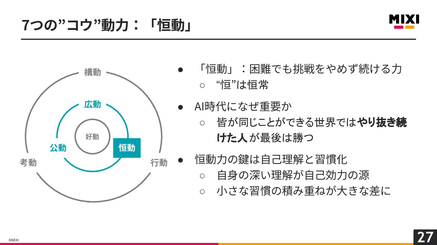 27 ©MIXI 7つの”コウ”動⼒:「恒動」 • 「恒動」:困難でも挑戦をやめず続ける⼒ ◦ “恒”は恒常 • AI時代になぜ重要か ◦