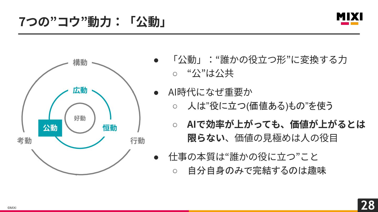 28 ©MIXI 7つの”コウ”動⼒:「公動」 • 「公動」:“誰かの役⽴つ形”に変換する⼒ ◦ “公”は公共 • AI時代になぜ重要か ◦