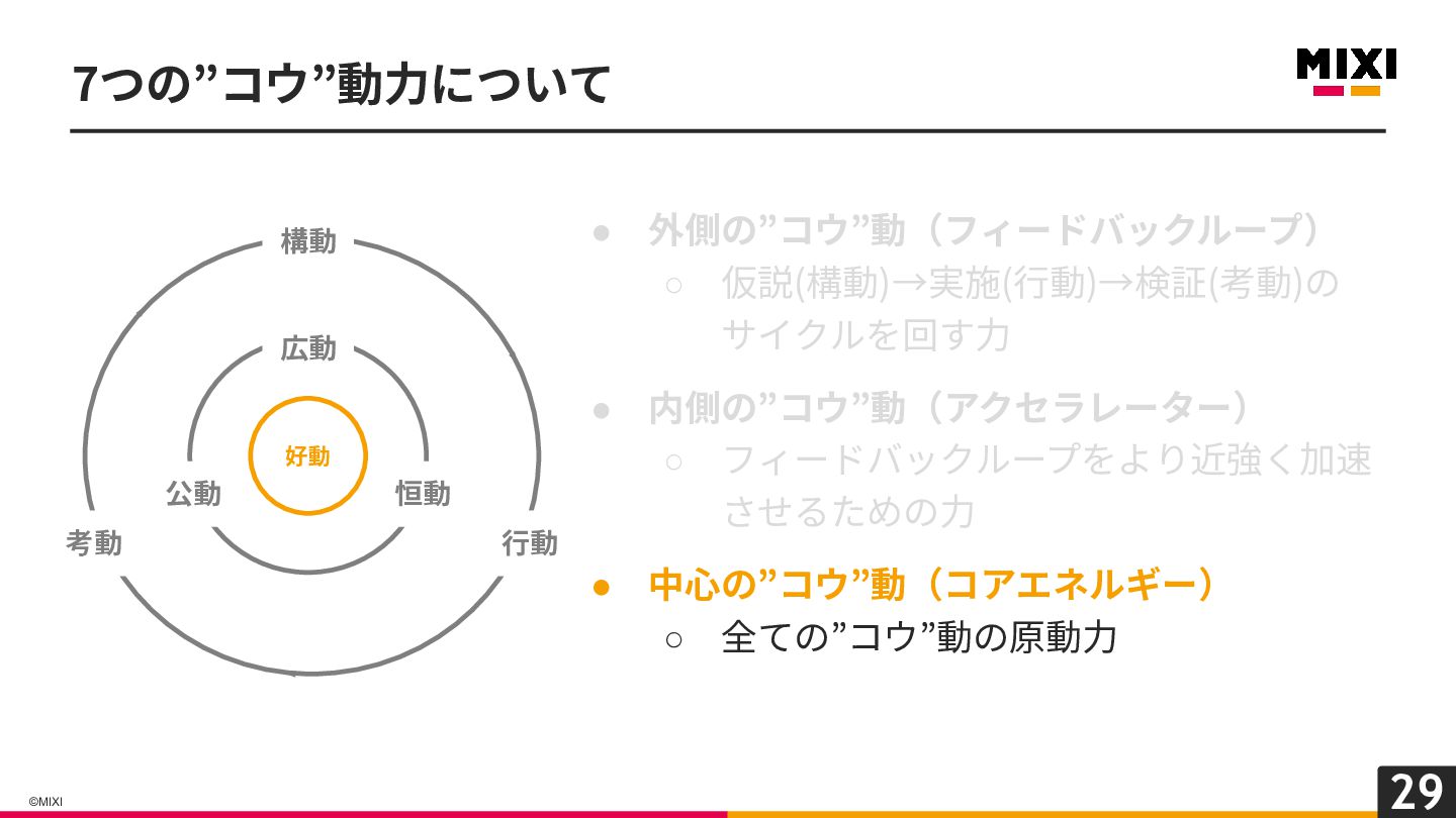 29 ©MIXI 7つの”コウ”動⼒について • 外側の”コウ”動(フィードバックループ) ◦ 仮説(構動)→実施(⾏動)→検証(考動)の サイクルを回す⼒ • 内側の”コウ”動(アクセラレーター)