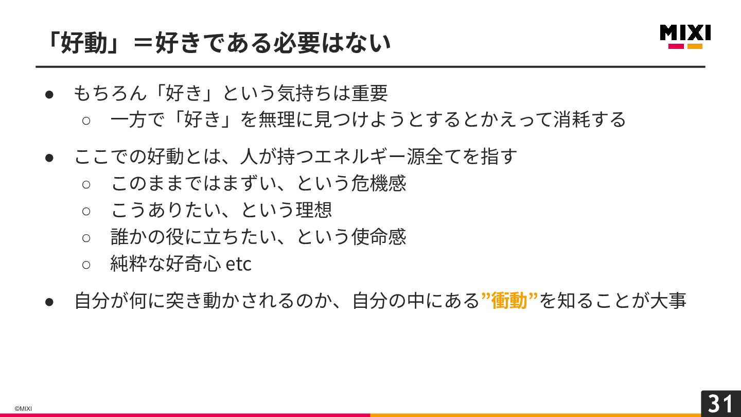31 ©MIXI • もちろん「好き」という気持ちは重要 ◦ ⼀⽅で「好き」を無理に⾒つけようとするとかえって消耗する • ここでの好動とは、⼈が持つエネルギー源全てを指す ◦ このままではまずい、という危機感