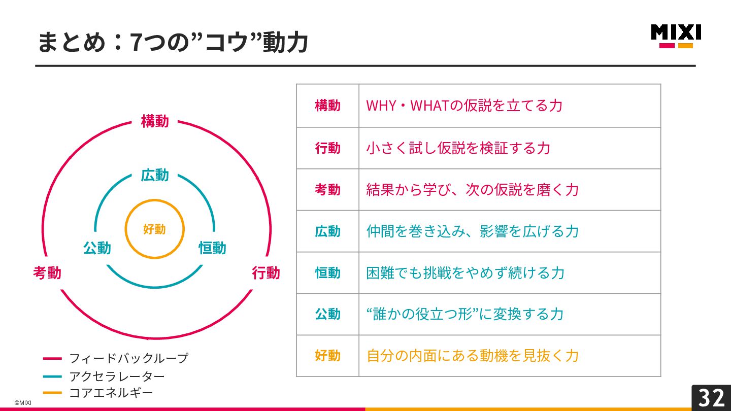 ◦ フィードバックループをより近強く加速 させるための⼒ • 中⼼の”コウ”動(コアエネルギー) ◦ 全ての”コウ”動の原動⼒ 好動 広動 恒動 公動 構動 ⾏動 考動