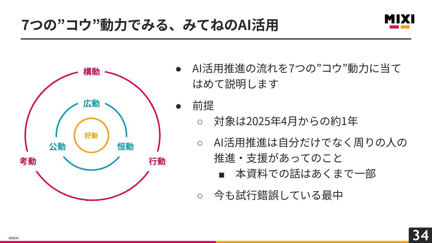 • AI活⽤推進の流れを7つの”コウ”動⼒に当て はめて説明します • 前提 ◦ 対象は2025年4⽉からの約1年 ◦ AI活⽤推進は⾃分だけでなく周りの⼈の 推進‧⽀援があってのこと ▪ 本資料での話はあくまで⼀部 ◦ 今も試⾏錯誤している最中