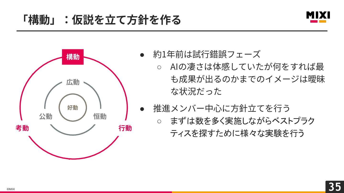 35 ©MIXI • 約1年前は試⾏錯誤フェーズ ◦ AIの凄さは体感していたが何をすれば最 も成果が出るのかまでのイメージは曖昧 な状況だった • 推進メンバー中⼼に⽅針⽴てを⾏う