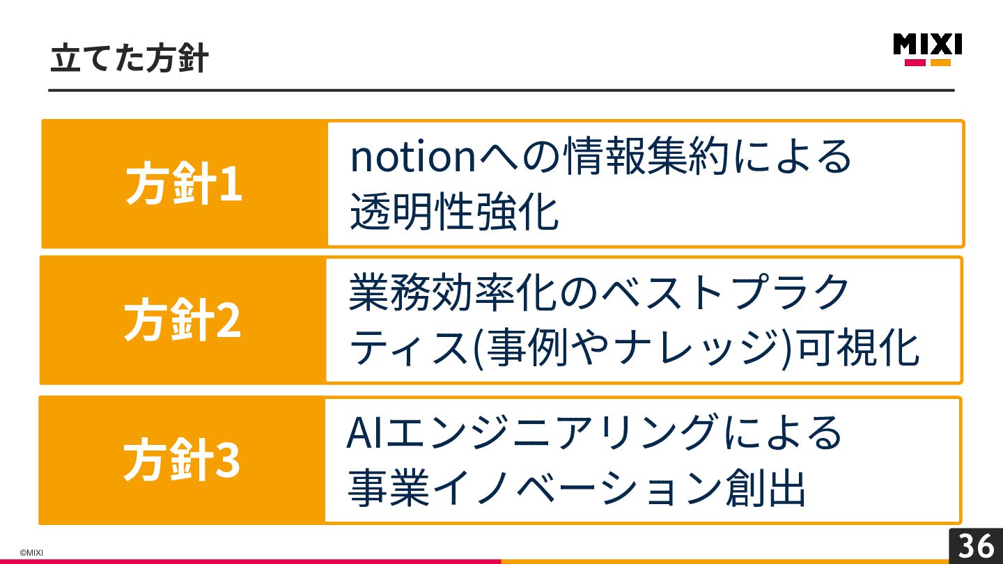 36 ©MIXI ⽴てた⽅針 notionへの情報集約による 透明性強化 ⽅針1 業務効率化のベストプラク ティス(事例やナレッジ)可視化 ⽅針2 AIエンジニアリングによる
