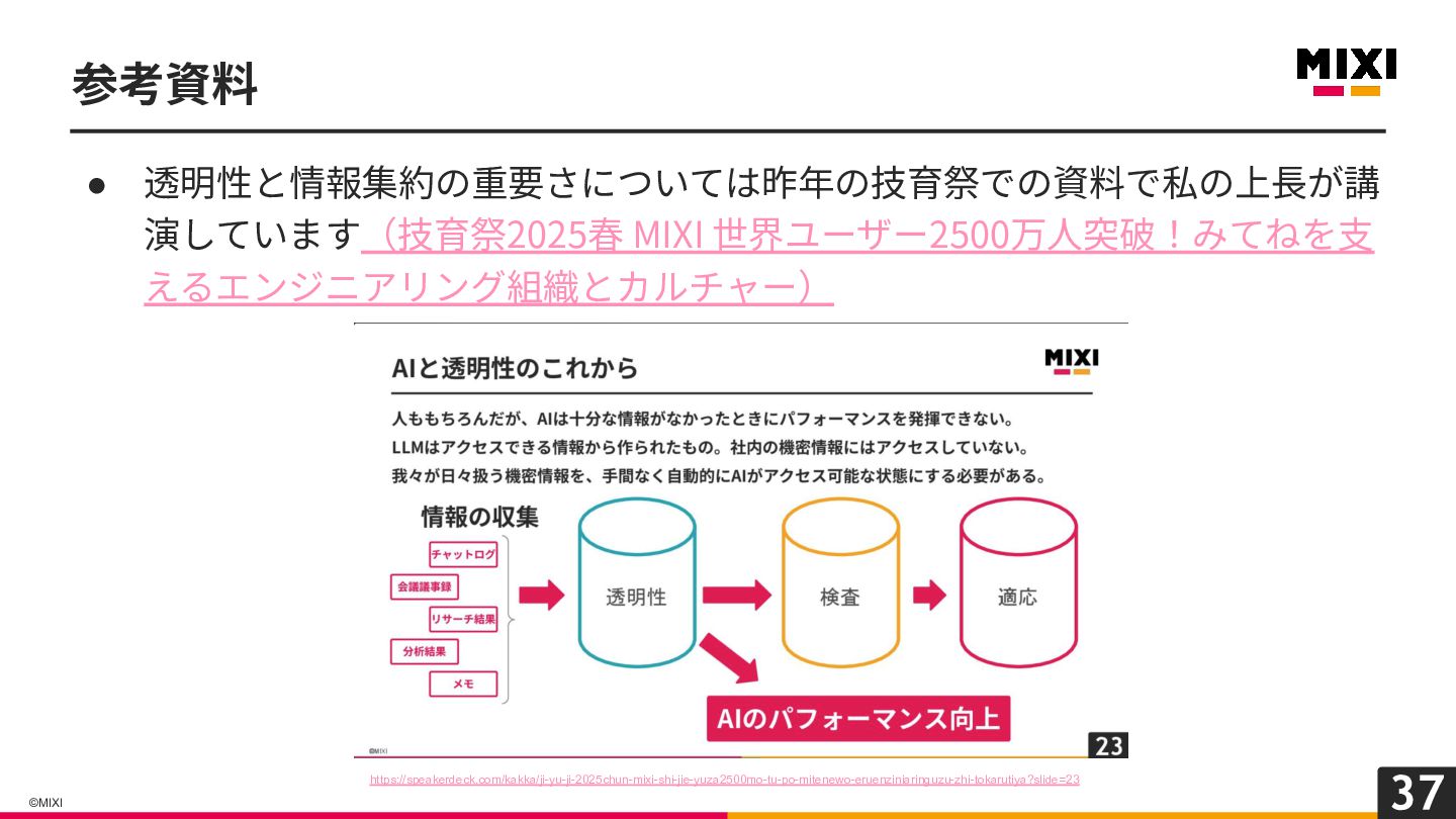 37 ©MIXI • 透明性と情報集約の重要さについては昨年の技育祭での資料で私の上⻑が講 演しています(技育祭2025春 MIXI 世界ユーザー2500万⼈突破!みてねを⽀ えるエンジニアリング組織とカルチャー) 参考資料 https://speakerdeck.com/kakka/ji-yu-ji-2025chun-mixi-shi-jie-yuza2500mo-tu-po-mitenewo-eruenziniaringuzu-zhi-tokarutiya?slide=23