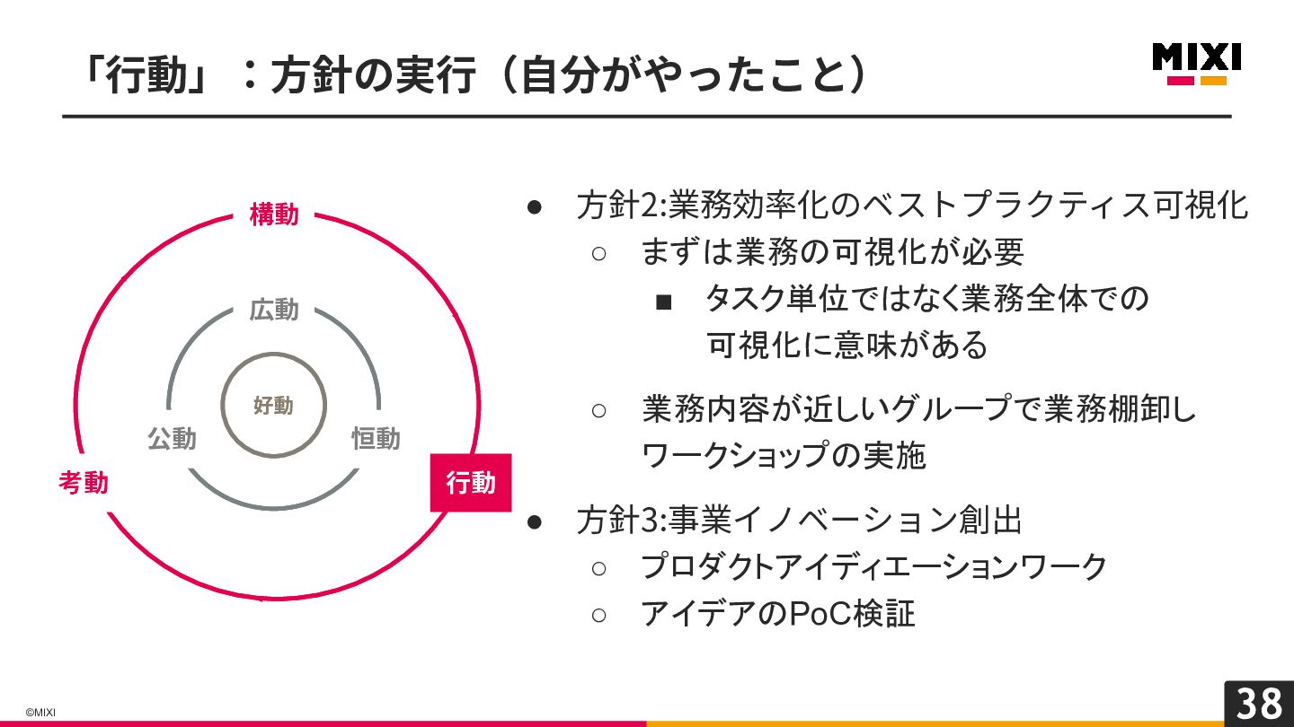業務内容が近しいグループで業務棚卸し ワークショップの実施 • ⽅針3:事業イノベーション創出 ◦ プロダクトアイディエーションワーク ◦ アイデアのPoC検証 「⾏動」:⽅針の実⾏(⾃分がやったこと) 好動 広動 恒動 公動 構動 ⾏動 考動 好動 広動 恒動 公動 構動 ⾏動 考動
