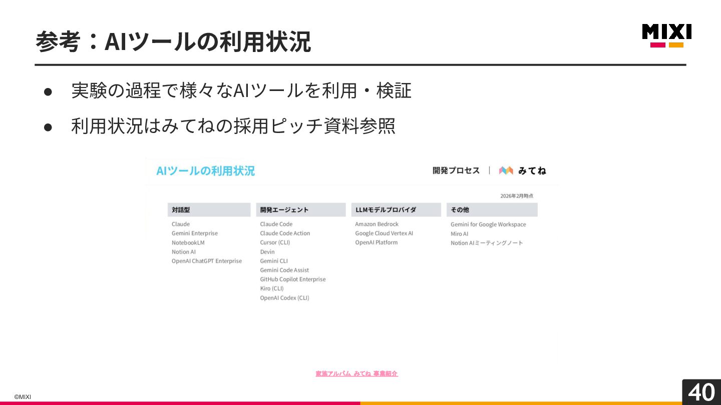 40 ©MIXI 参考:AIツールの利⽤状況 • 実験の過程で様々なAIツールを利⽤‧検証 • 利⽤状況はみてねの採⽤ピッチ資料参照 家族アルバム みてね 事業紹介