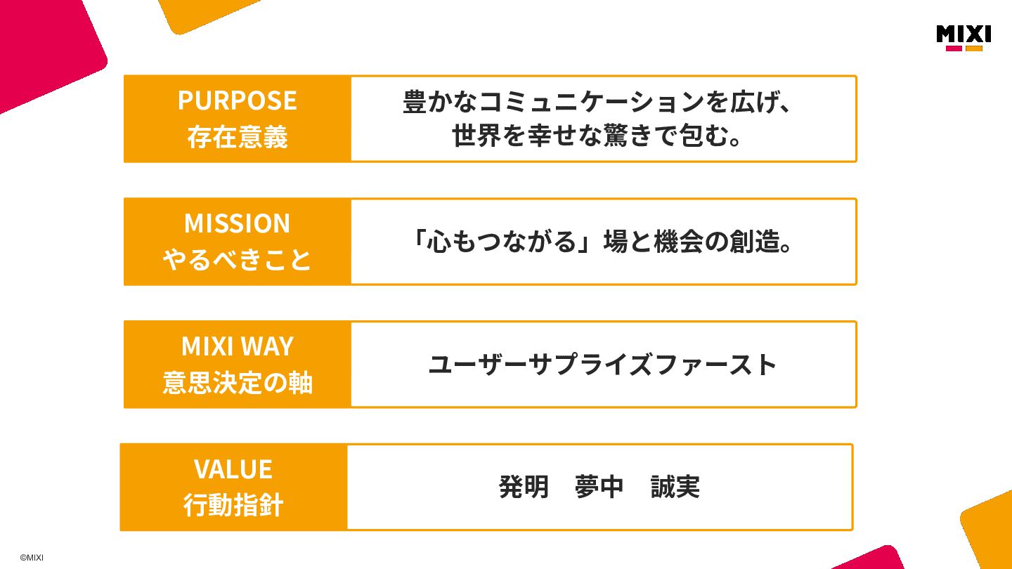 ©MIXI 豊かなコミュニケーションを広げ、 世界を幸せな驚きで包む。 PURPOSE 存在意義 「⼼もつながる」場と機会の創造。 MISSION やるべきこと ユーザーサプライズファースト MIXI