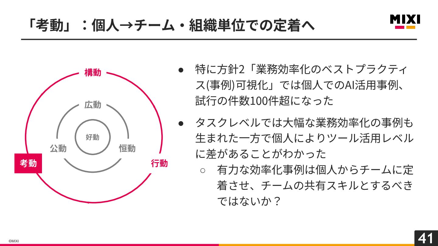 41 ©MIXI • 特に⽅針2「業務効率化のベストプラクティ ス(事例)可視化」では個⼈でのAI活⽤事例、 試⾏の件数100件超になった • タスクレベルでは⼤幅な業務効率化の事例も ⽣まれた⼀⽅で個⼈によりツール活⽤レベル に差があることがわかった