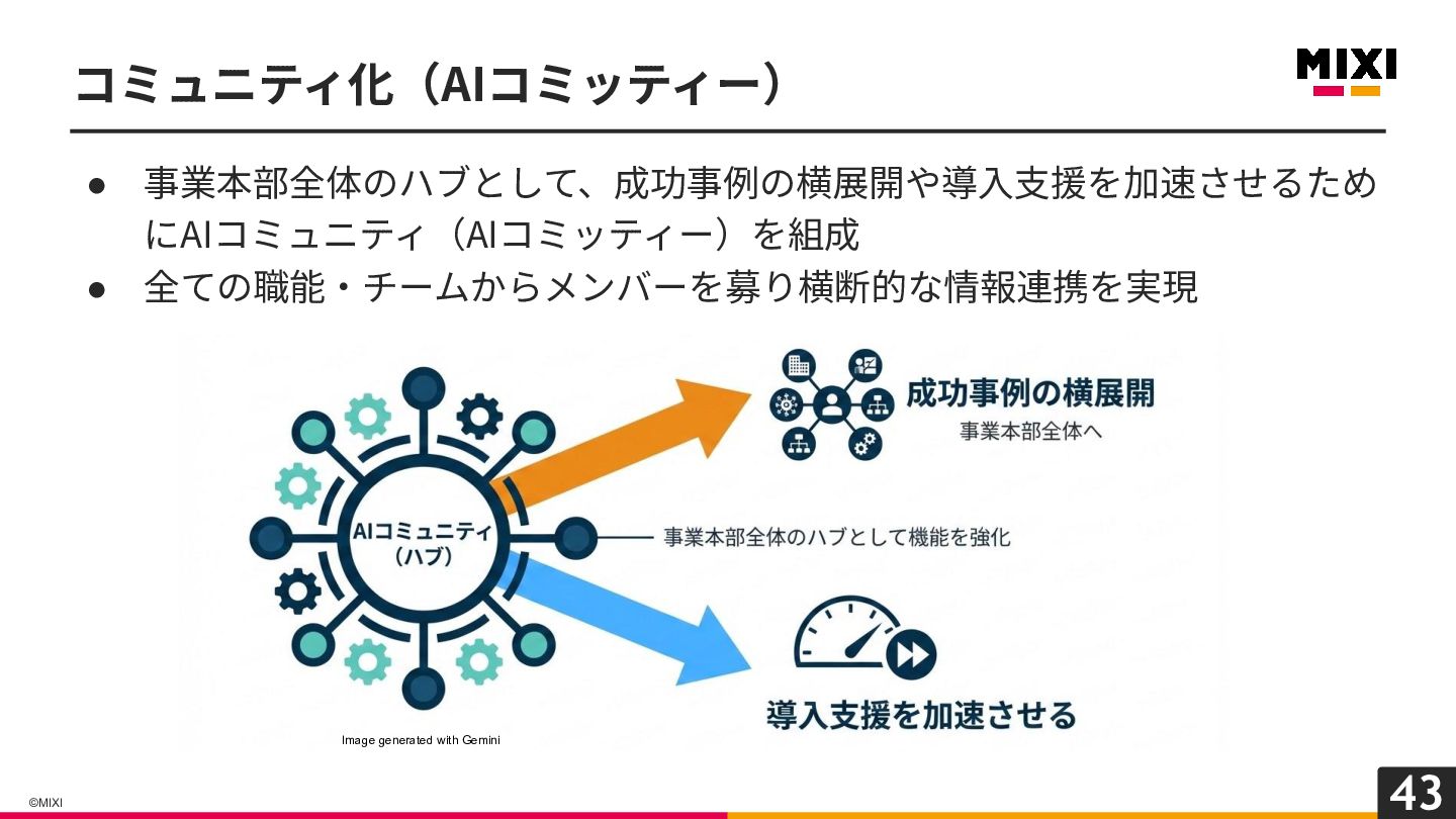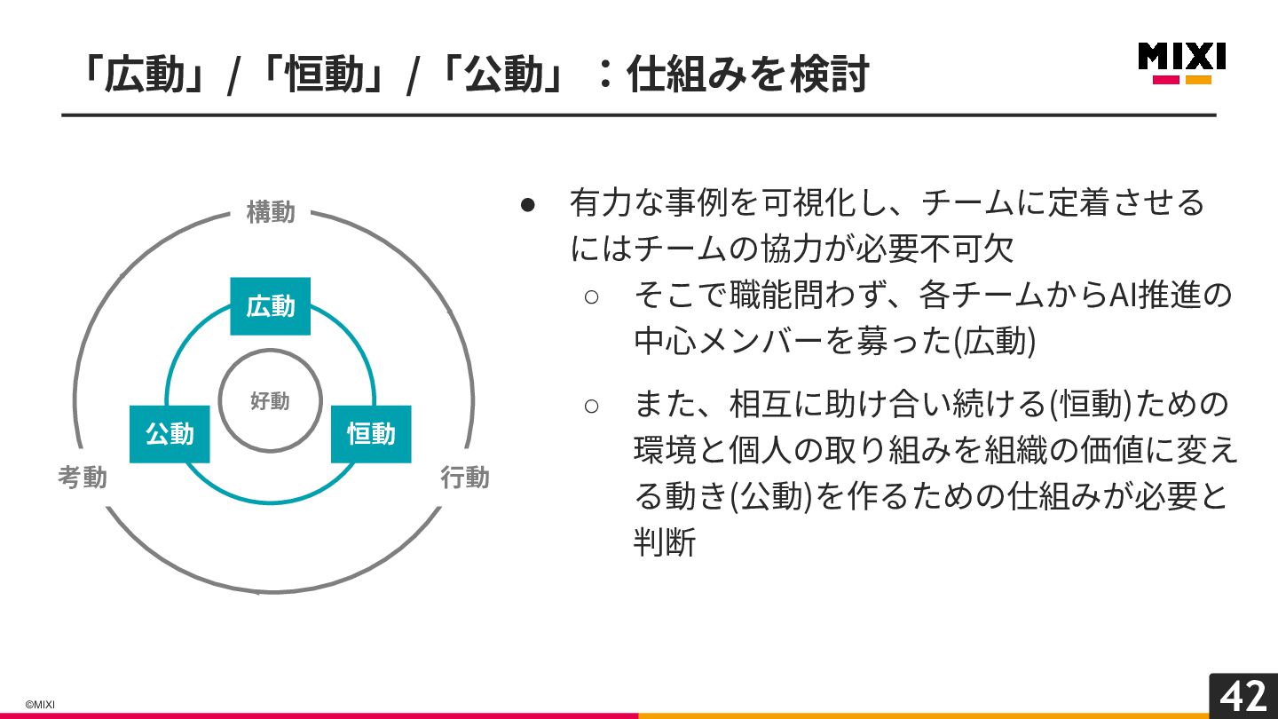 42 ©MIXI • 有⼒な事例を可視化し、チームに定着させる にはチームの協⼒が必要不可⽋ ◦ そこで職能問わず、各チームからAI推進の 中⼼メンバーを募った(広動) ◦ また、相互に助け合い続ける(恒動)ための