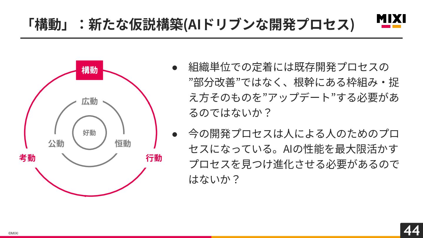 プロセスを⾒つけ進化させる必要があるので はないか? 「構動」:新たな仮説構築(AIドリブンな開発プロセス) 好動 広動 恒動 公動 構動 ⾏動 考動