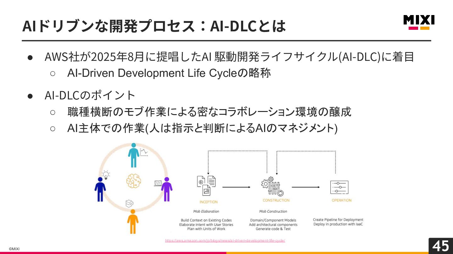 45 ©MIXI • AWS社が2025年8⽉に提唱したAI 駆動開発ライフサイクル(AI-DLC)に着⽬ ◦ AI-Driven Development Life Cycleの略称