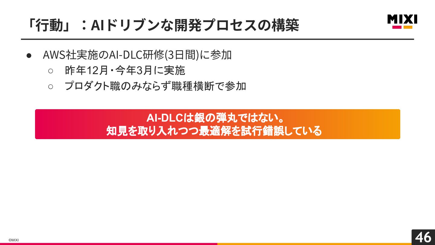 46 ©MIXI • AWS社実施のAI-DLC研修(3⽇間)に参加 ◦ 昨年12月・今年3月に実施 ◦ プロダクト職のみならず職種横断で参加 「⾏動」:AIドリブンな開発プロセスの構築 AI-DLCは銀の弾丸ではない。