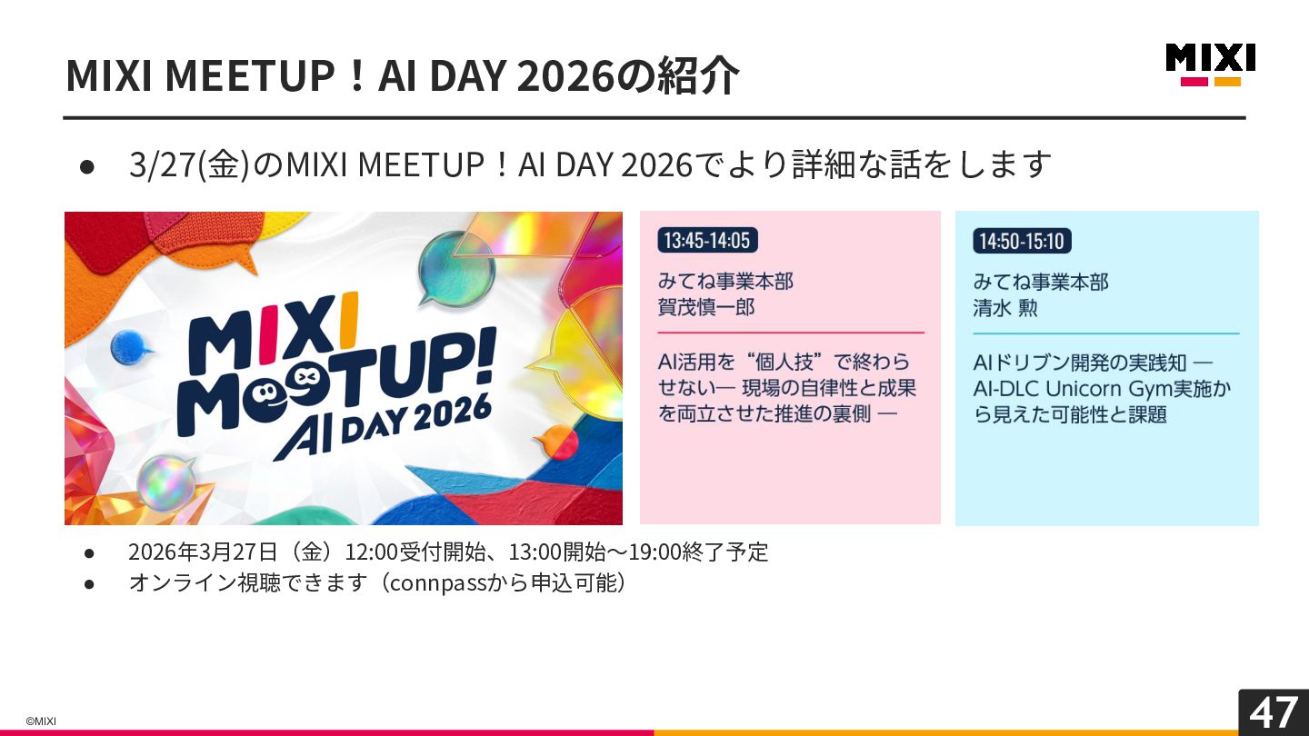 47 ©MIXI MIXI MEETUP!AI DAY 2026の紹介 • 3/27(⾦)のMIXI MEETUP!AI DAY