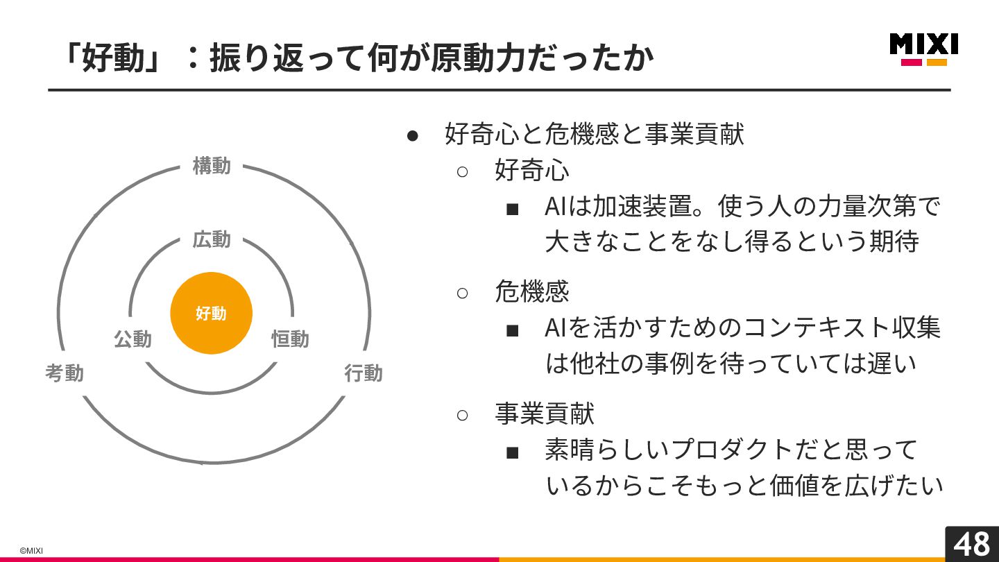 危機感 ▪ AIを活かすためのコンテキスト収集 は他社の事例を待っていては遅い ◦ 事業貢献 ▪ 素晴らしいプロダクトだと思って いるからこそもっと価値を広げたい 「好動」:振り返って何が原動⼒だったか 好動 広動 恒動 公動 構動 ⾏動 考動