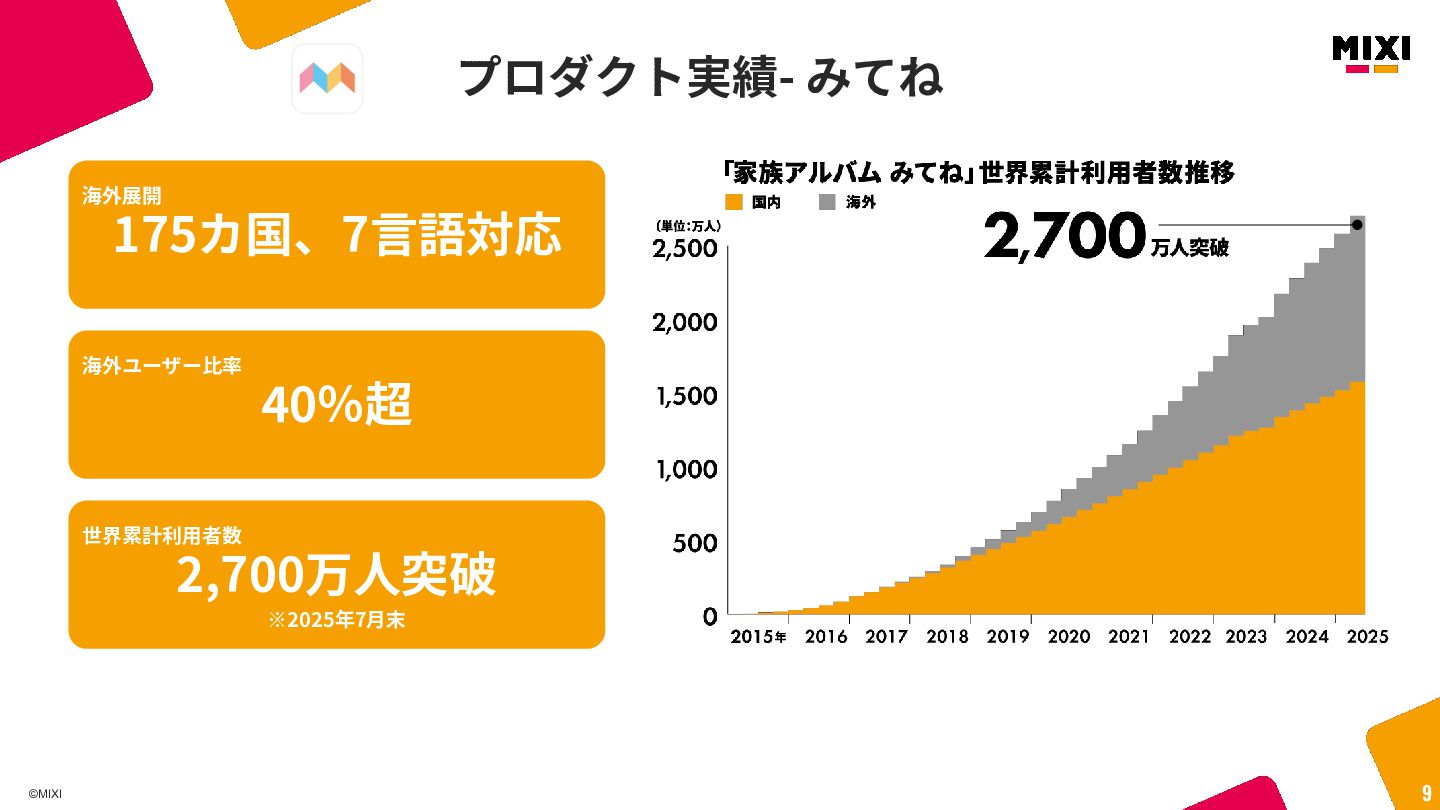 ©MIXI 9 175カ国、7⾔語対応 海外展開 40%超 海外ユーザー⽐率 2,700万⼈突破 世界累計利⽤者数 ※2025年7⽉末 プロダクト実績-