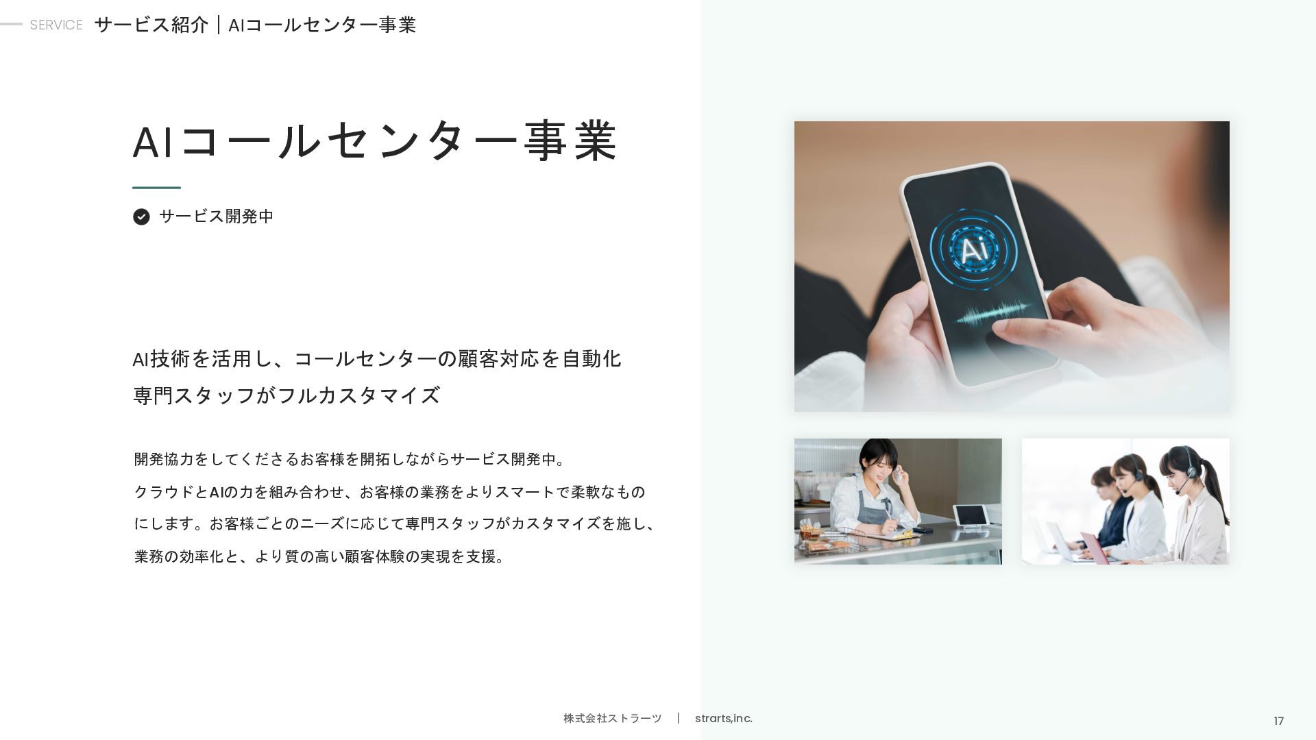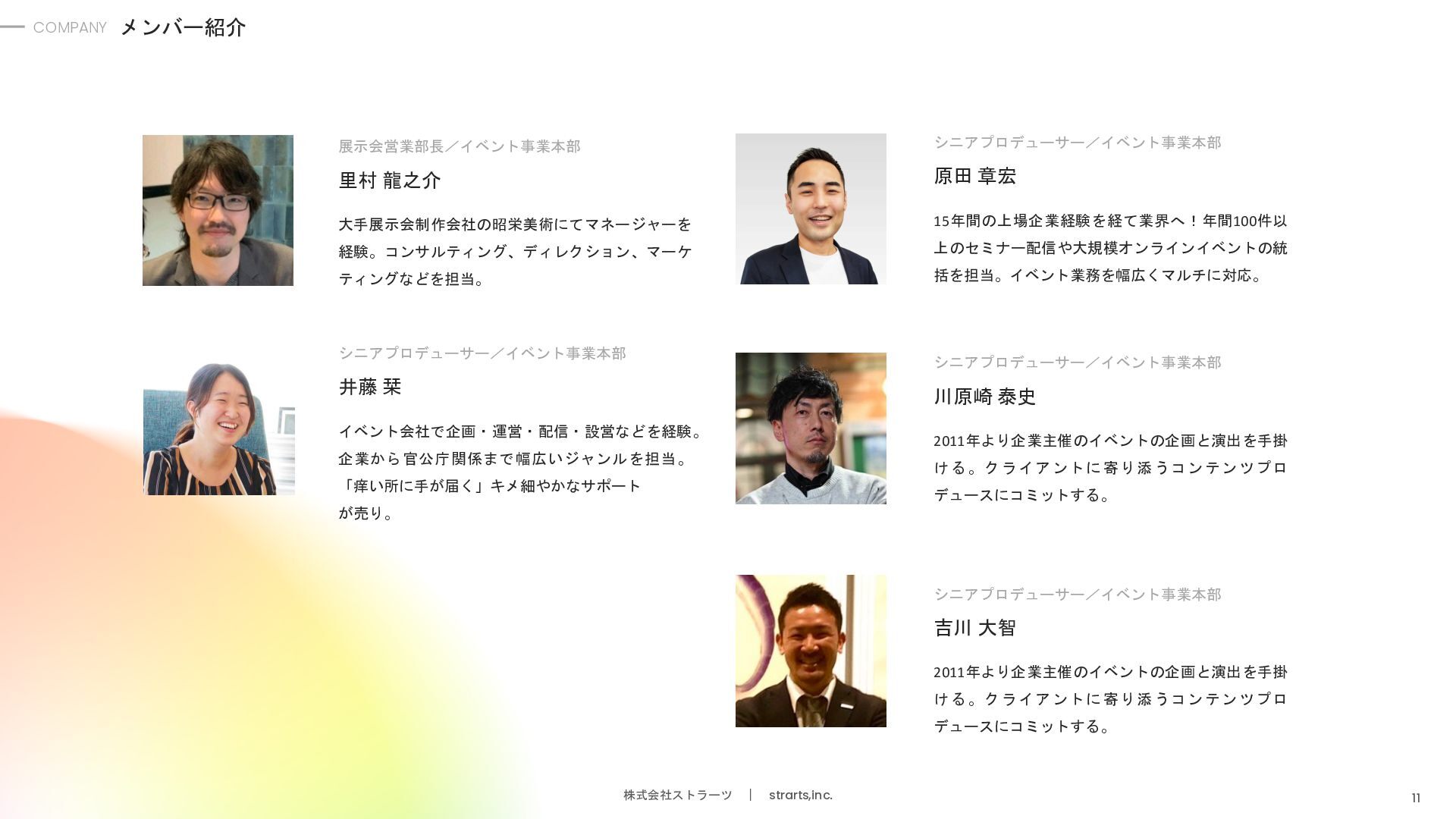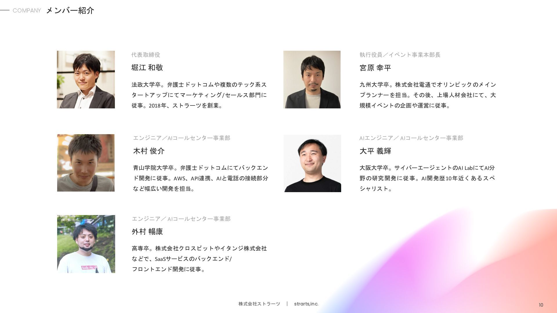 堀江 和敬 エンジニア/ AIコールセンター事業部 高専卒。株式会社クロスビットやイタンジ株式会社 などで、SaaSサービスのバックエンド/ フロントエンド開発に従事。 外村 暢康 AIエンジニア/ AIコールセンター事業部 大阪大学卒。サイバーエージェントのAI LabにてAI分 野の研究開発に従事。AI開発歴10年近くあるスペ シャリスト。 大平 義輝 エンジニア/AIコールセンター事業部 青山学院大学卒。弁護士ドットコムにてバックエン ド開発に従事。AWS、API連携、AIと電話の接続部分 など幅広い開発を担当。 木村 俊介 執行役員/イベント事業本部長 九州大学卒。株式会社電通でオリンピックのメイン プランナーを担当。その後、上場人材会社にて、大 規模イベントの企画や運営に従事。 宮原 幸平