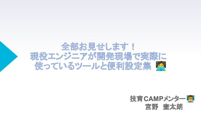 全部お見せします! 現役エンジニアが開発現場で実際に 使っているツールと便利設定集 技育CAMPメンター 宮野 奎太朗