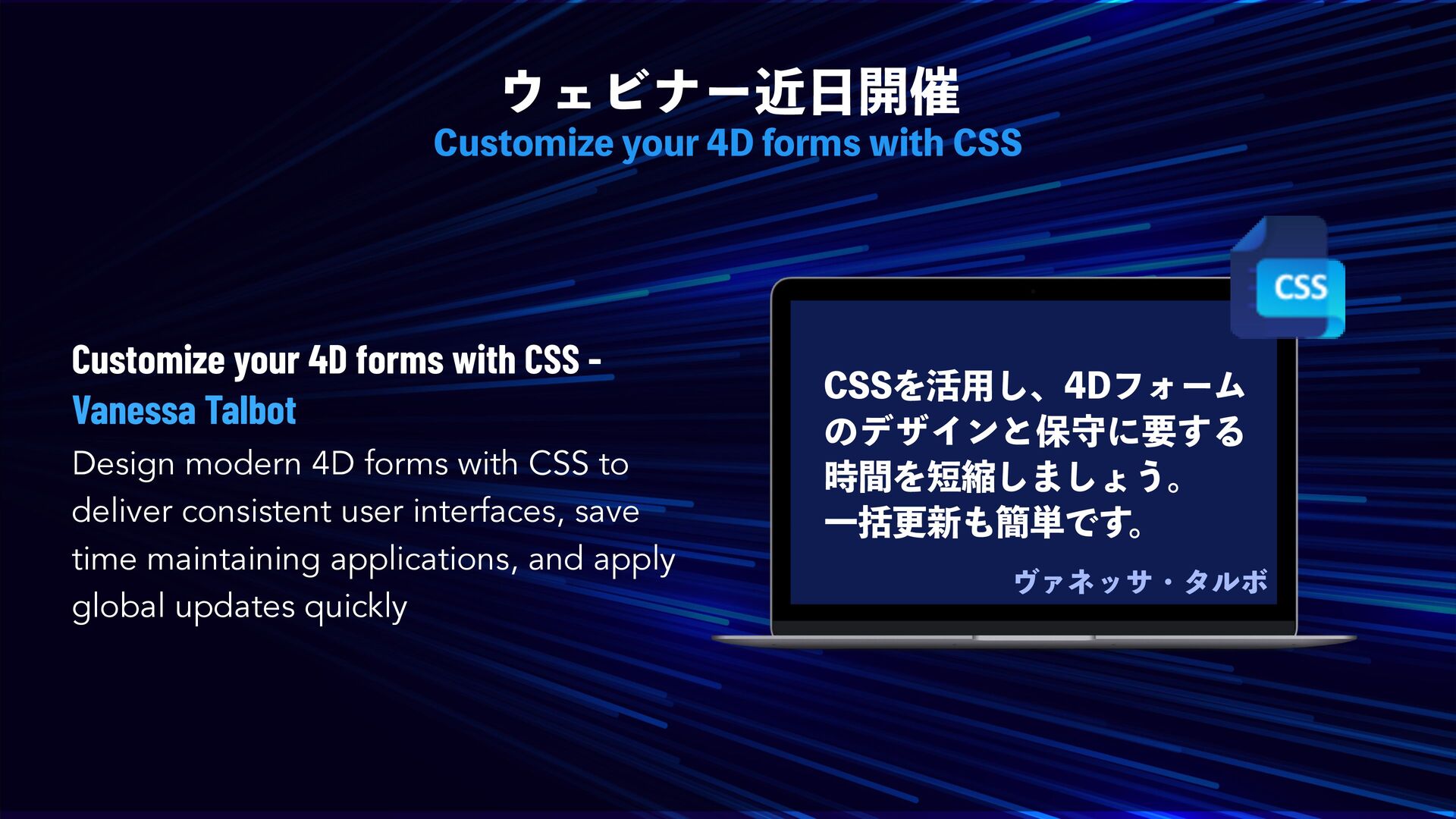 consistent user interfaces, save time maintaining applications, and apply global updates quickly Customize your 4D forms with CSS - Vanessa Talbot ϰΝωοαɾλϧϘ $44Λ׆༻͠ɺ%ϑΥʔϜ ͷσβΠϯͱอकʹཁ͢Δ ࣌ؒΛॖ͠·͠ΐ͏ɻ Ұׅߋ৽؆୯Ͱ͢ɻ