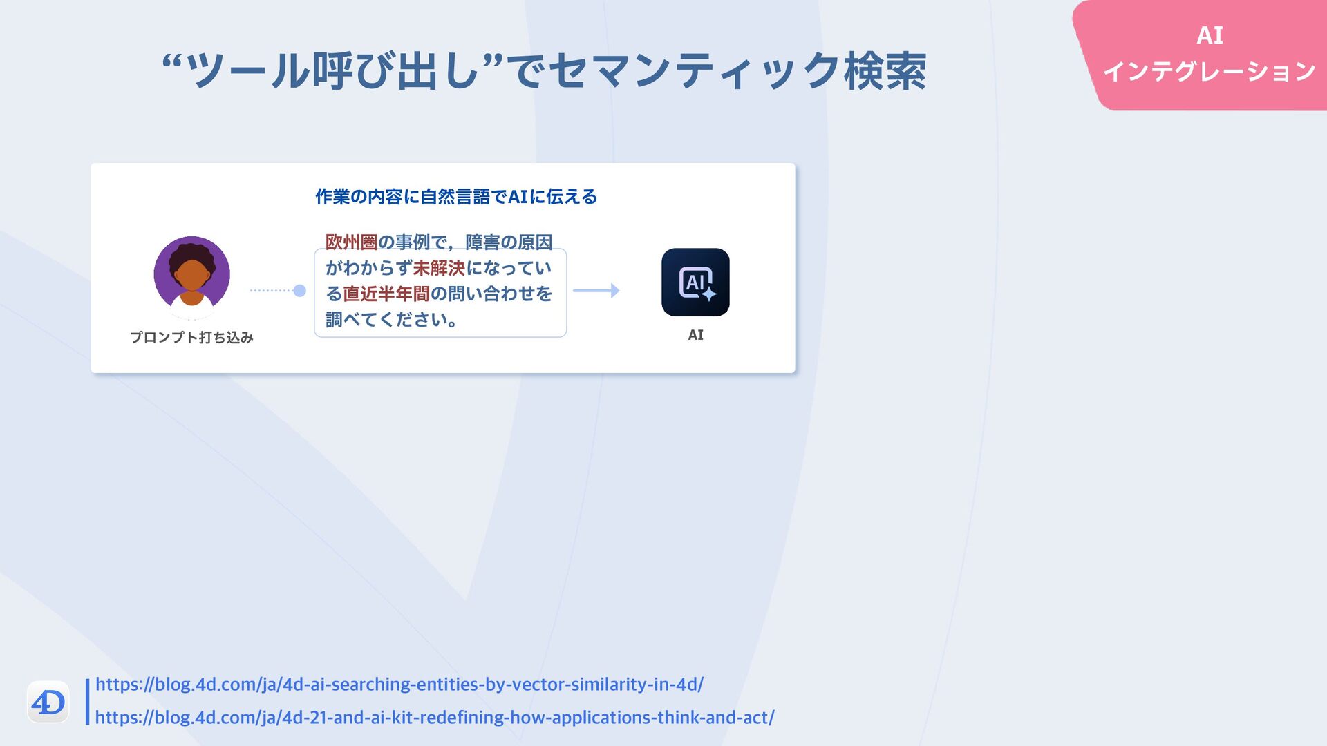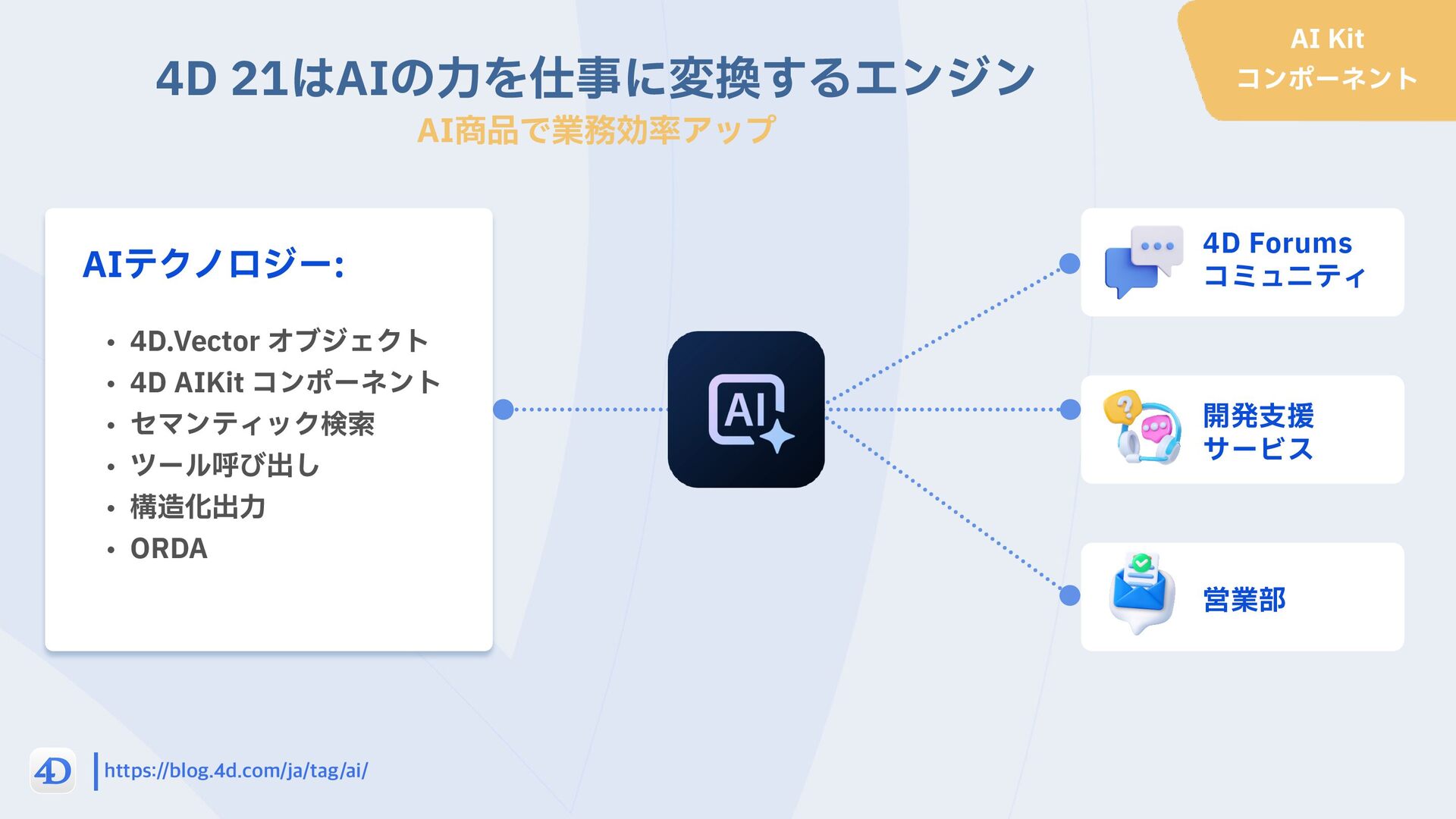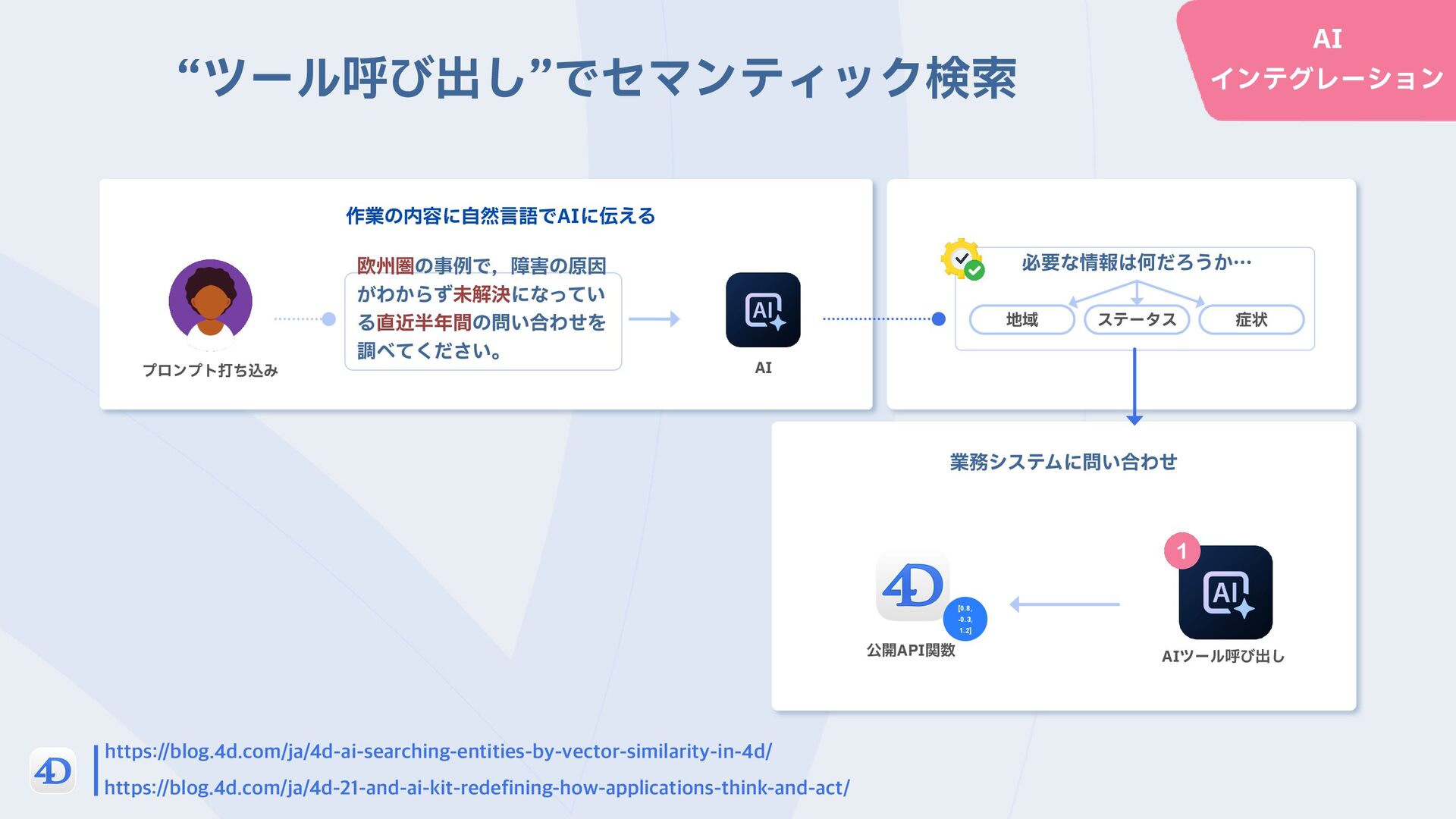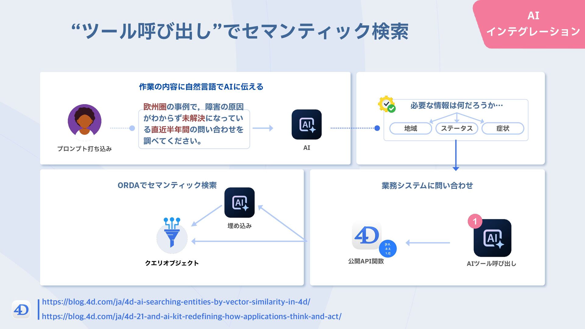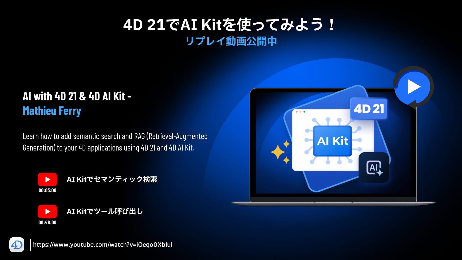 - Mathieu Ferry Learn how to add semantic search and RAG (Retrieval-Augmented Generation) to your 4D applications using 4D 21 and 4D AI Kit. リプレイ動画公開中 4D 21でAI Kitを使ってみよう! AI Kitでセマンティック検索 00:03:00 00:48:00 AI Kitでツール呼び出し