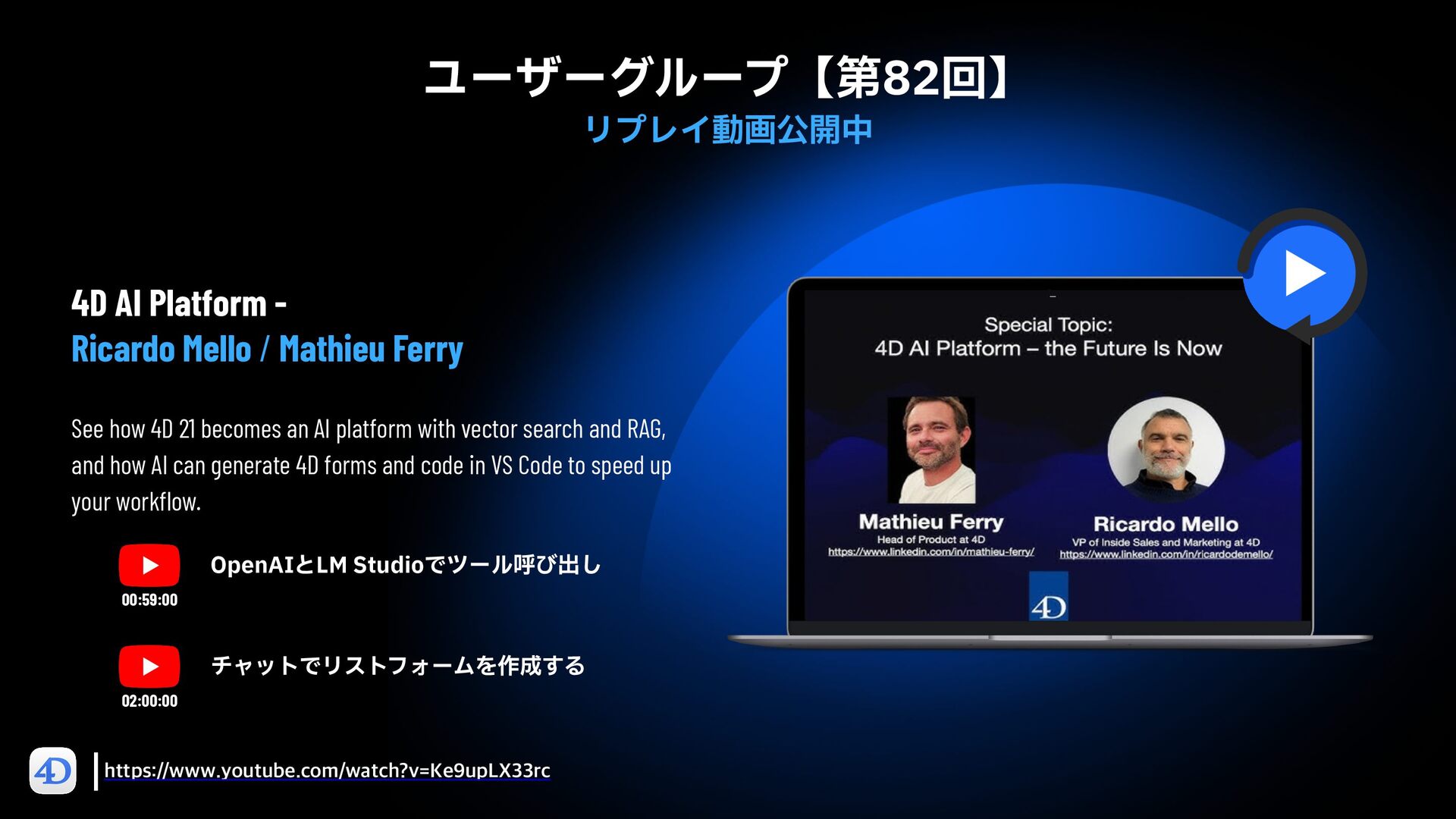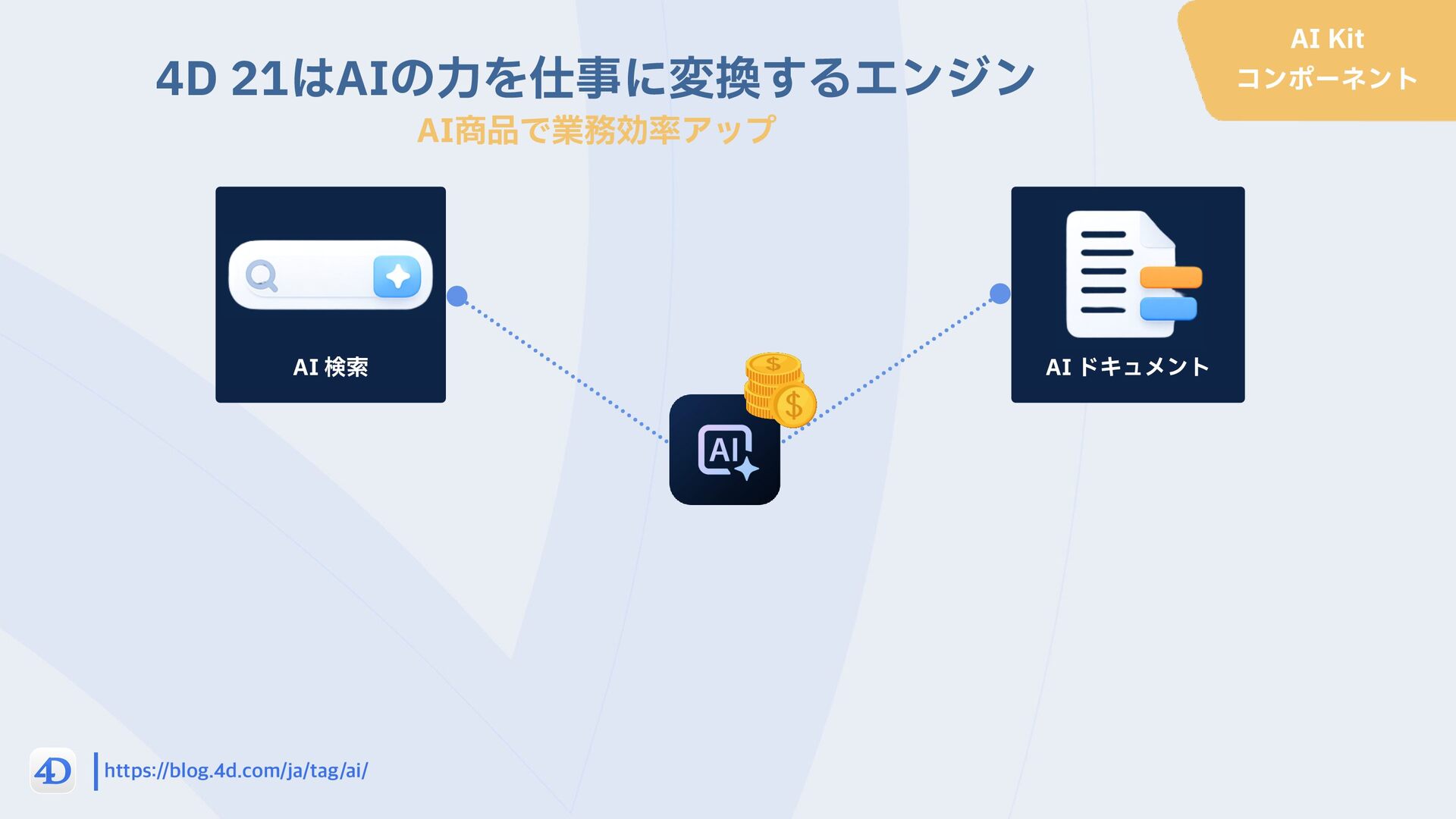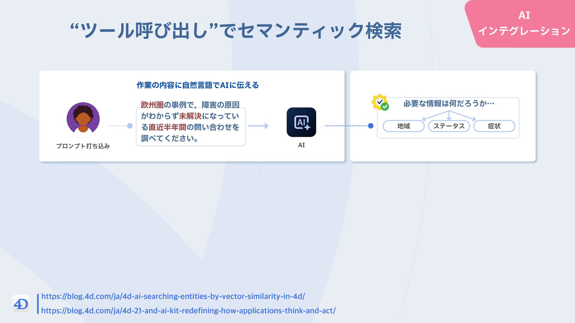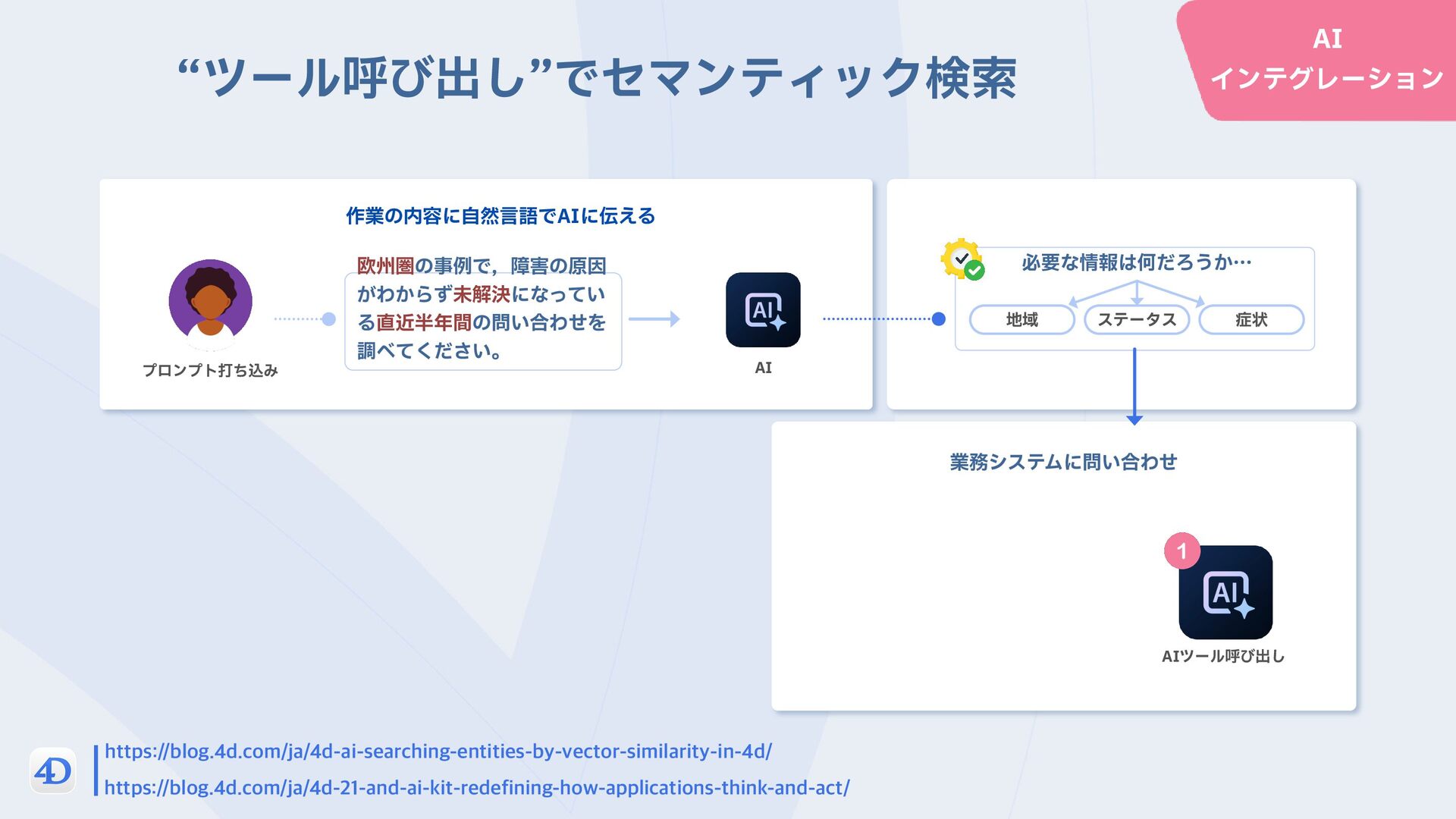 - Mathieu Ferry Learn how to add semantic search and RAG (Retrieval-Augmented Generation) to your 4D applications using 4D 21 and 4D AI Kit. リプレイ動画公開中 4D 21でAI Kitを使ってみよう! AI Kitでセマンティック検索 00:03:00 00:48:00 AI Kitでツール呼び出し