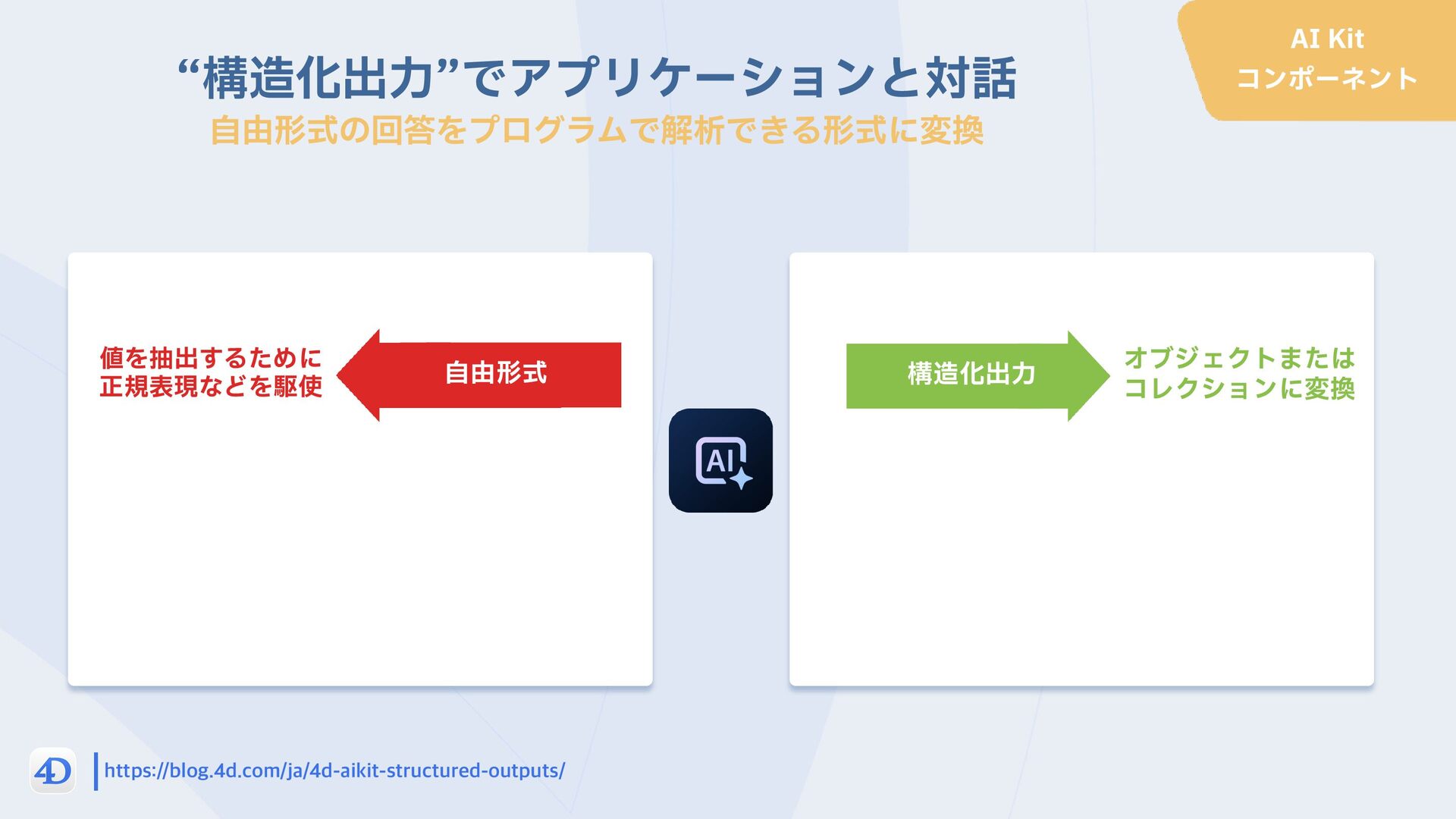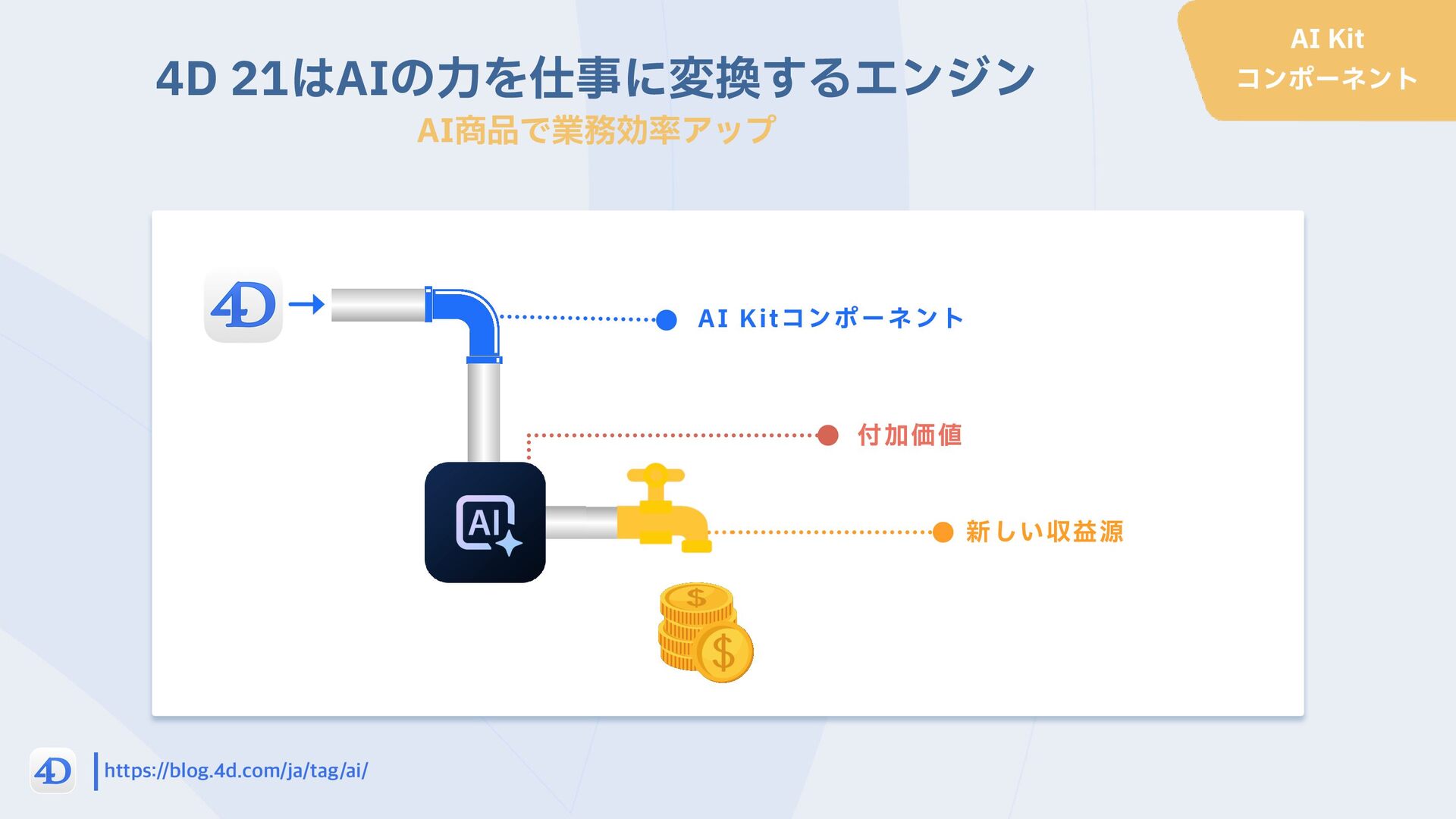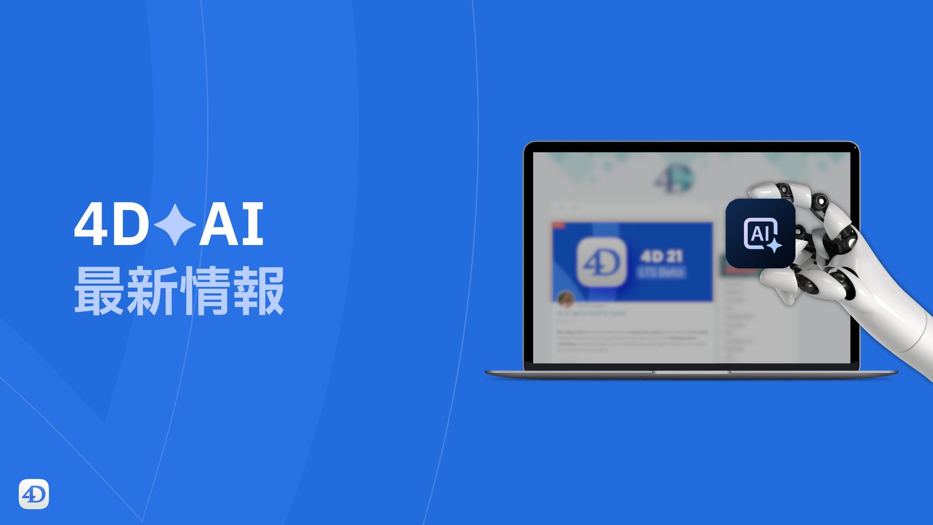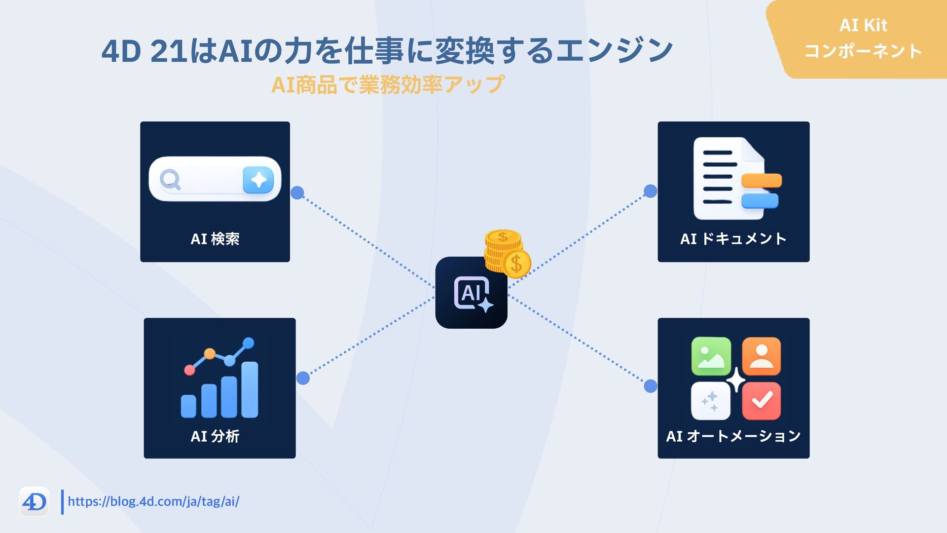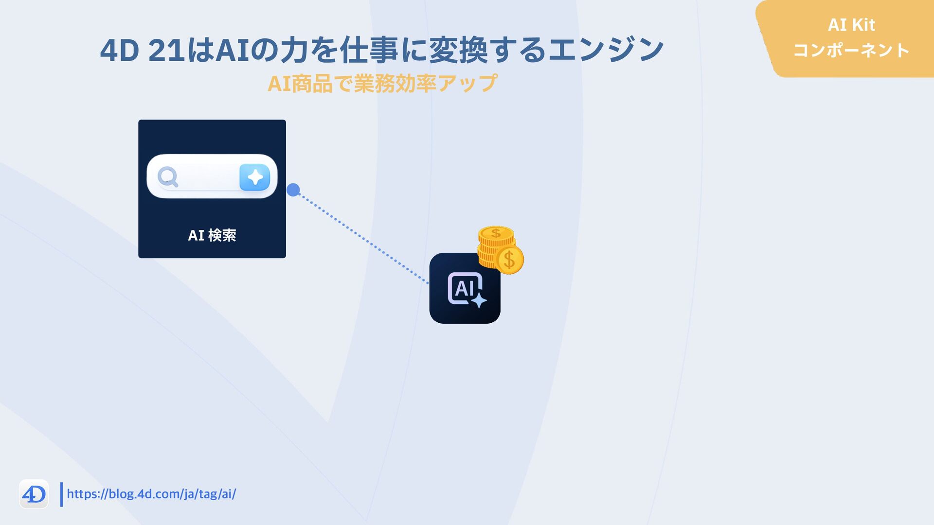 - Mathieu Ferry Learn how to add semantic search and RAG (Retrieval-Augmented Generation) to your 4D applications using 4D 21 and 4D AI Kit. リプレイ動画公開中 4D 21でAI Kitを使ってみよう! AI Kitでセマンティック検索 00:03:00 00:48:00 AI Kitでツール呼び出し