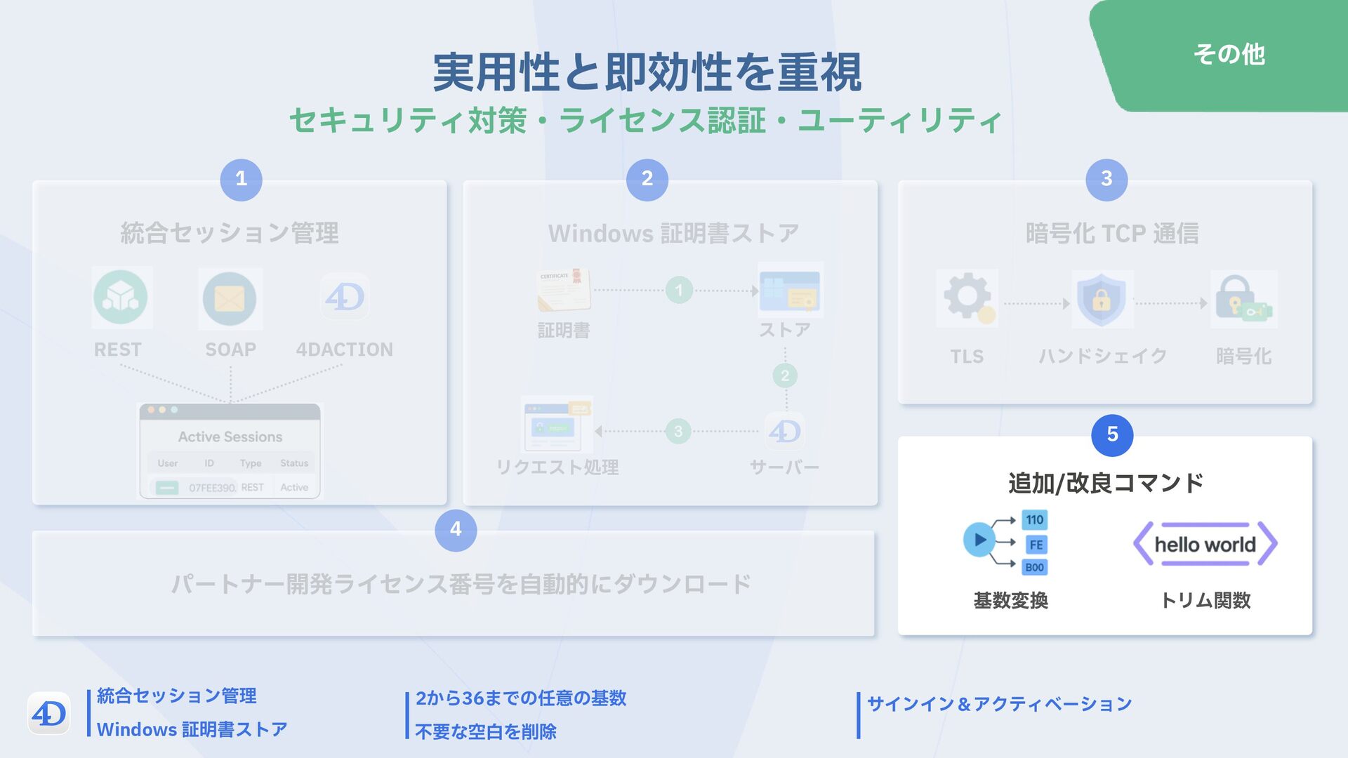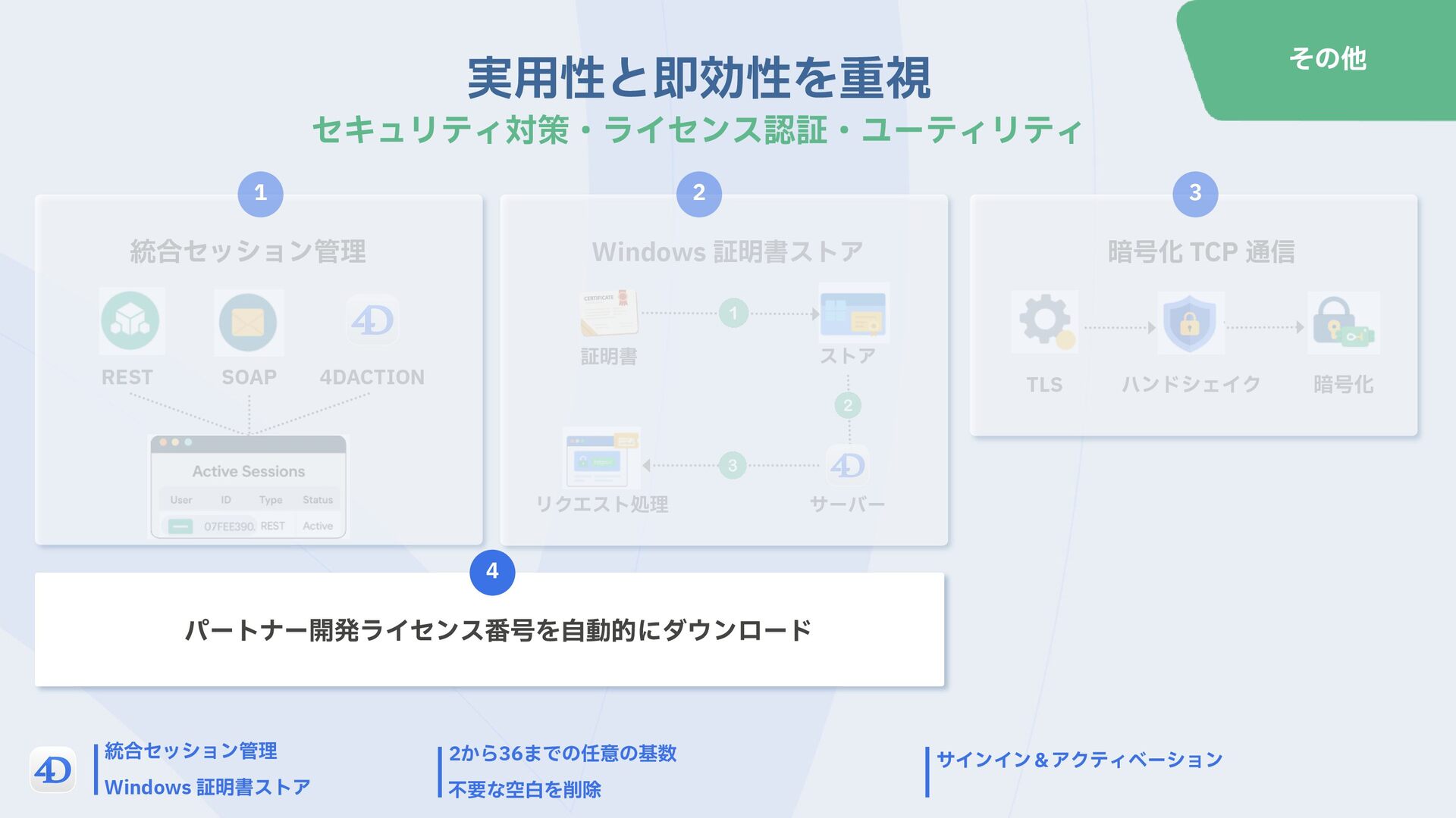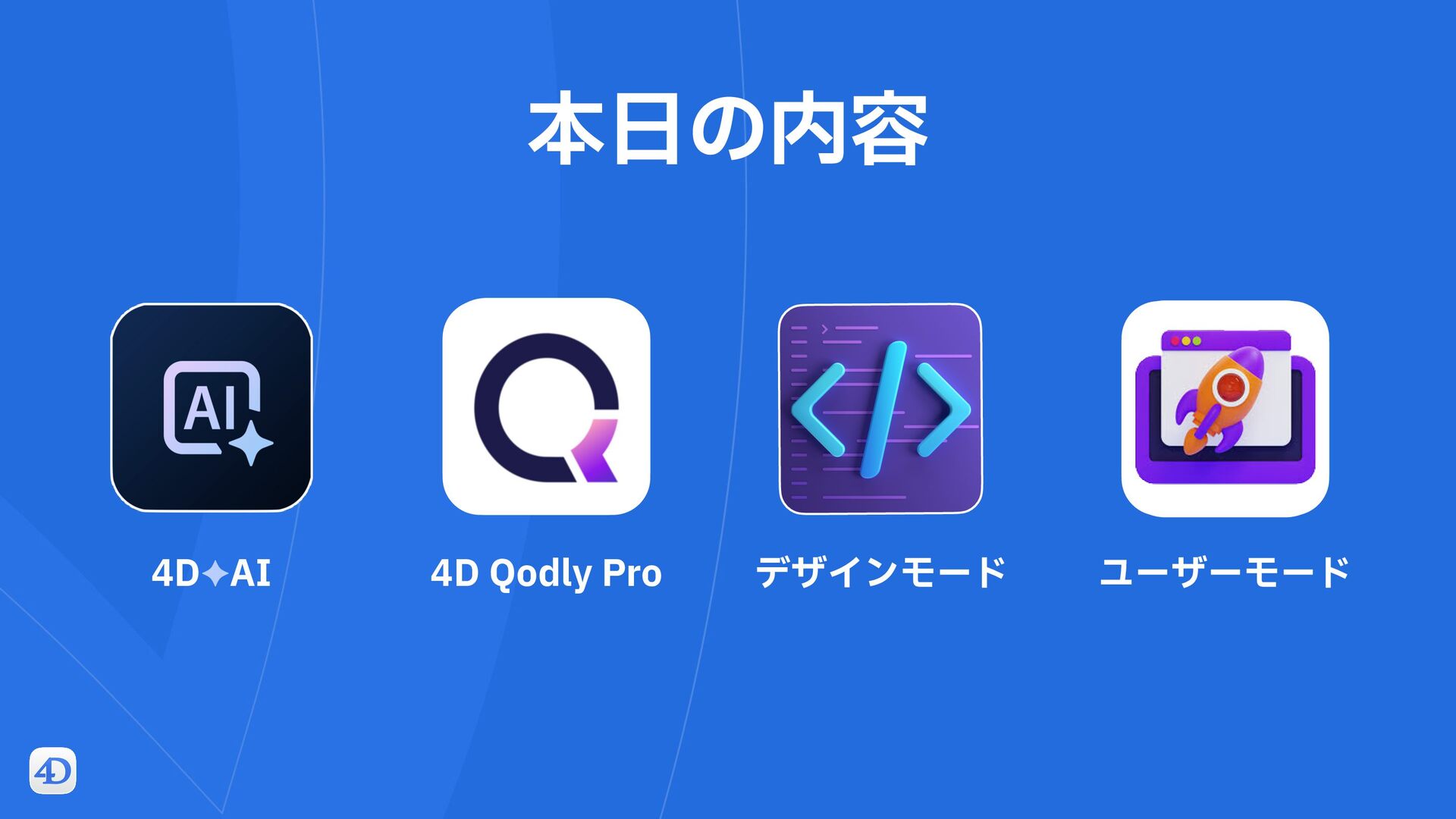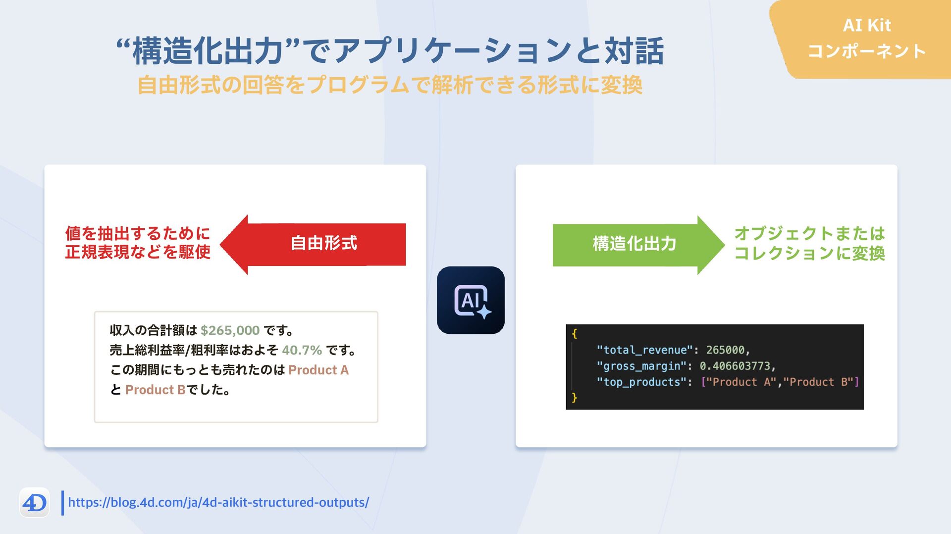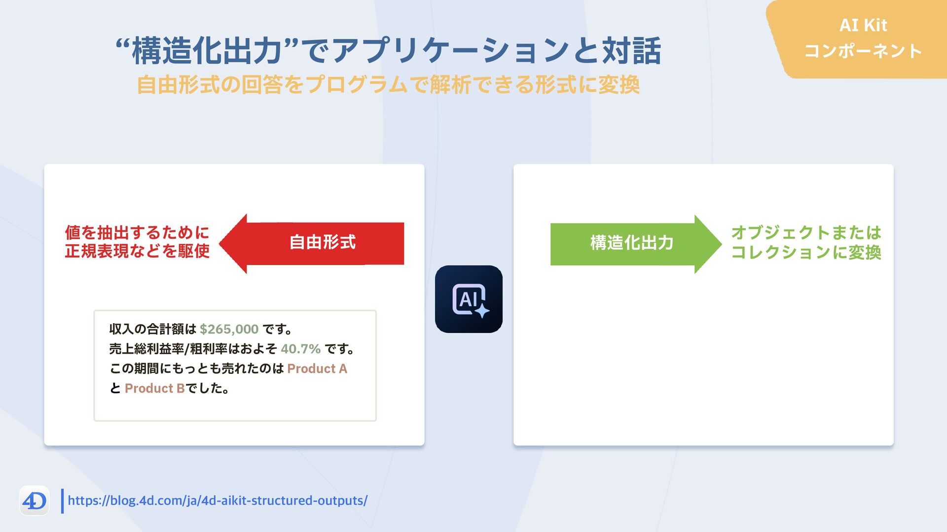 - Mathieu Ferry Learn how to add semantic search and RAG (Retrieval-Augmented Generation) to your 4D applications using 4D 21 and 4D AI Kit. リプレイ動画公開中 4D 21でAI Kitを使ってみよう! AI Kitでセマンティック検索 00:03:00 00:48:00 AI Kitでツール呼び出し