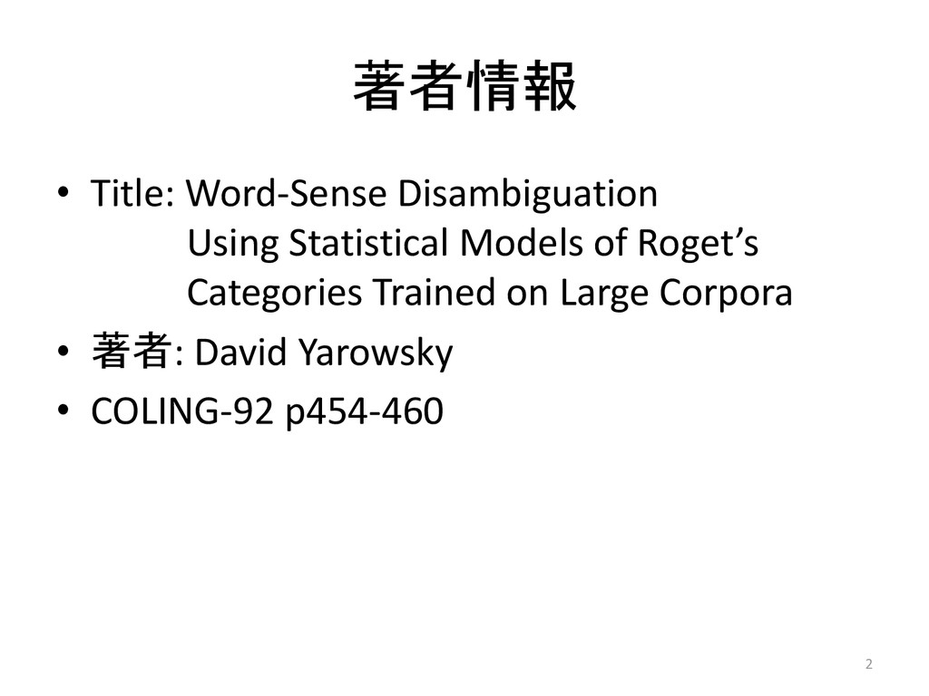 著者情報 • Title: Word-Sense Disambiguation Using Statistical Models of Roget’s