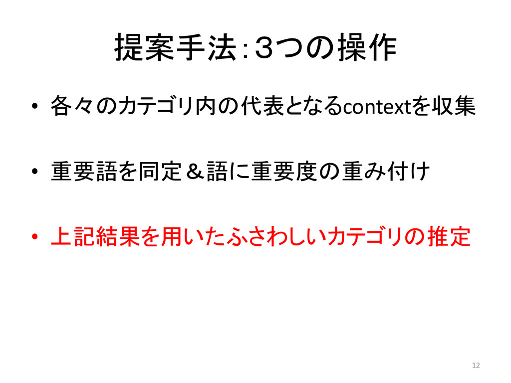 提案手法:3つの操作 • 各々のカテゴリ内の代表となるcontextを収集 • 重要語を同定&語に重要度の重み付け • 上記結果を用いたふさわしいカテゴリの推定 12