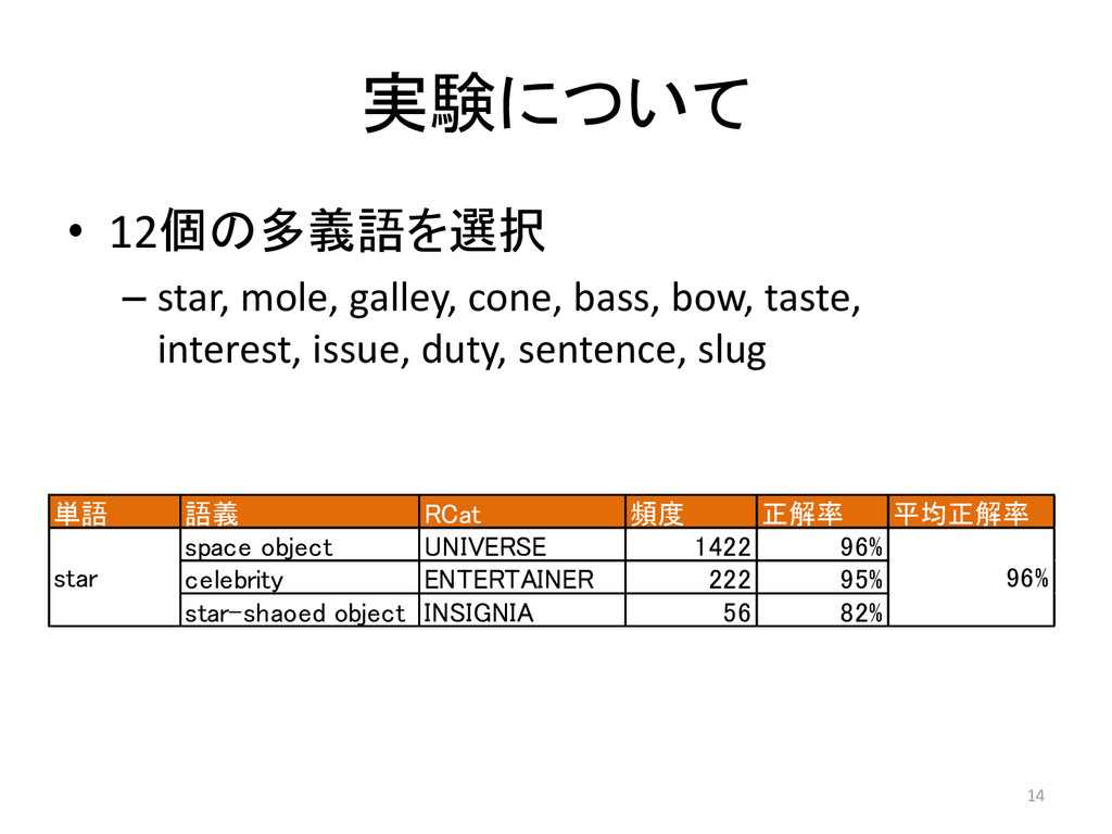 taste, interest, issue, duty, sentence, slug 単語 語義 RCat 頻度 正解率 平均正解率 space object UNIVERSE 1422 96% celebrity ENTERTAINER 222 95% star-shaoed object INSIGNIA 56 82% star 96% 14