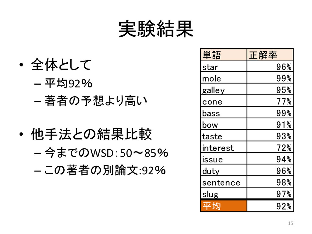 今までのWSD:50~85% – この著者の別論文:92% 単語 正解率 star 96% mole 99% galley 95% cone 77% bass 99% bow 91% taste 93% interest 72% issue 94% duty 96% sentence 98% slug 97% 平均 92% 15