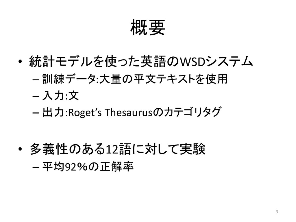 概要 • 統計モデルを使った英語のWSDシステム – 訓練データ:大量の平文テキストを使用 – 入力:文 – 出力:Roget’s Thesaurusのカテゴリタグ