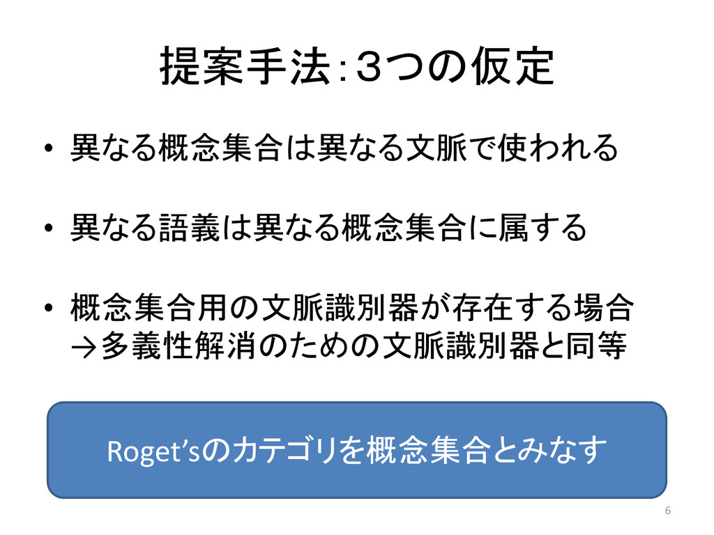 提案手法:3つの仮定 • 異なる概念集合は異なる文脈で使われる • 異なる語義は異なる概念集合に属する • 概念集合用の文脈識別器が存在する場合 →多義性解消のための文脈識別器と同等 Roget’sのカテゴリを概念集合とみなす 6