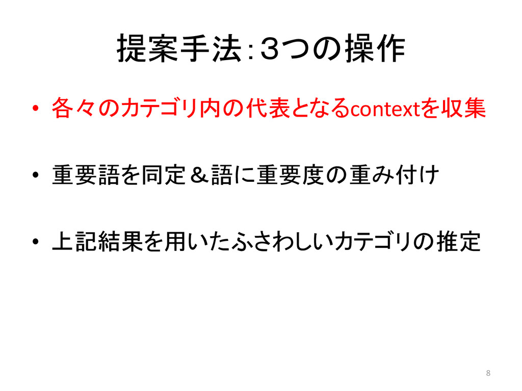 提案手法:3つの操作 • 各々のカテゴリ内の代表となるcontextを収集 • 重要語を同定&語に重要度の重み付け • 上記結果を用いたふさわしいカテゴリの推定 7