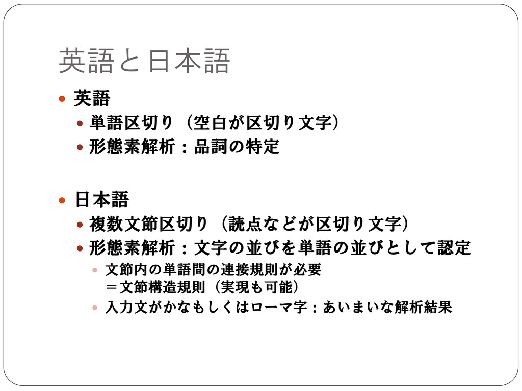 英語と日本語 英語 単語区切り(空白が区切り文字) 形態素解析:品詞の特定 日本語