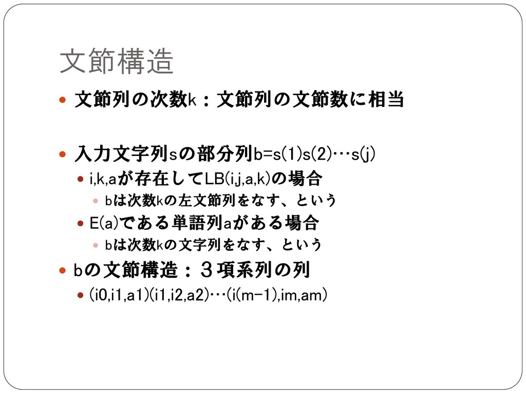 文節構造 文節列の次数k:文節列の文節数に相当 入力文字列sの部分列b=s(1)s(2)…s(j) i,k,aが存在してLB(i,j,a,k)の場合 bは次数kの左文節列をなす、という