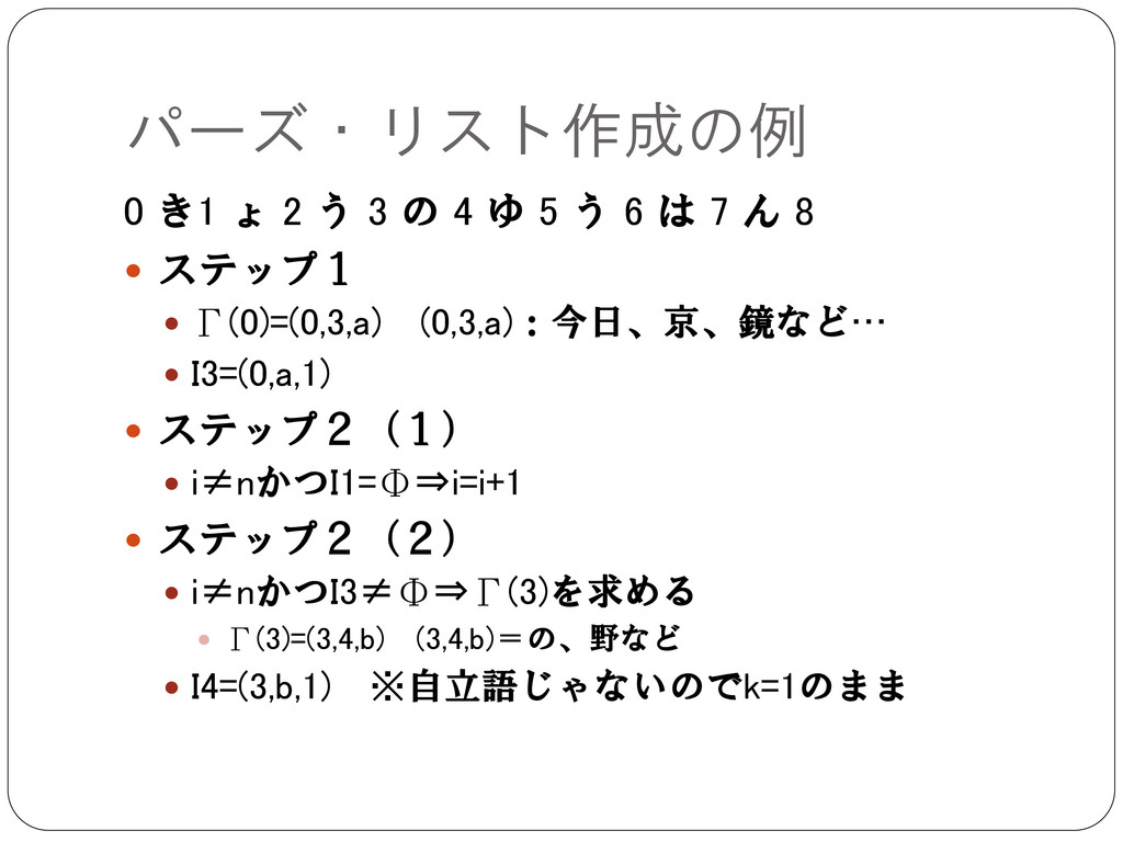 5 う 6 は 7 ん 8 ステップ1 Γ(0)=(0,3,a) (0,3,a):今日、京、鏡など… I3=(0,a,1) ステップ2(1) i≠nかつI1=Φ⇒i=i+1 ステップ2(2) i≠nかつI3≠Φ⇒Γ(3)を求める Γ(3)=(3,4,b) (3,4,b)=の、野など I4=(3,b,1) ※自立語じゃないのでk=1のまま