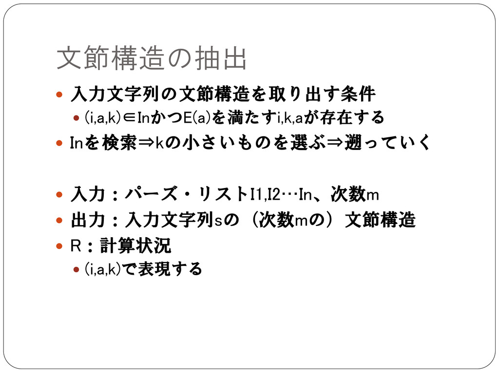 文節構造の抽出 入力文字列の文節構造を取り出す条件 (i,a,k)∈InかつE(a)を満たすi,k,aが存在する Inを検索⇒kの小さいものを選ぶ⇒遡っていく 入力:パーズ・リストI1,I2…In、次数m