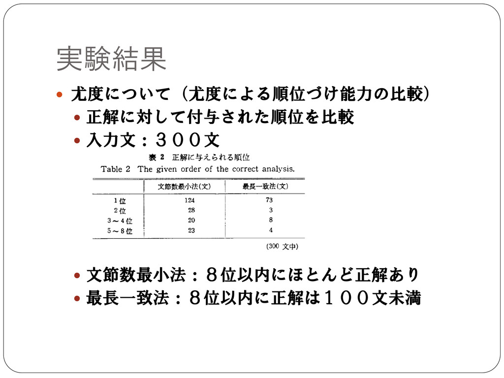 実験結果 尤度について(尤度による順位づけ能力の比較) 正解に対して付与された順位を比較 入力文:300文 文節数最小法:8位以内にほとんど正解あり