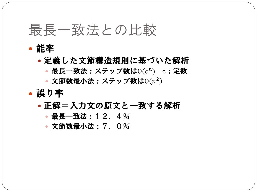 最長一致法との比較 能率 定義した文節構造規則に基づいた解析 最長一致法:ステップ数はO() c:定数 文節数最小法:ステップ数はO
