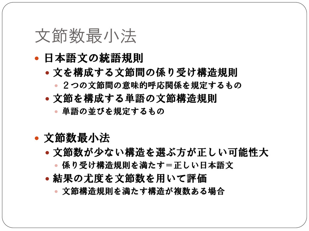 単語の並びを規定するもの 文節数最小法 文節数が少ない構造を選ぶ方が正しい可能性大 係り受け構造規則を満たす=正しい日本語文 結果の尤度を文節数を用いて評価 文節構造規則を満たす構造が複数ある場合