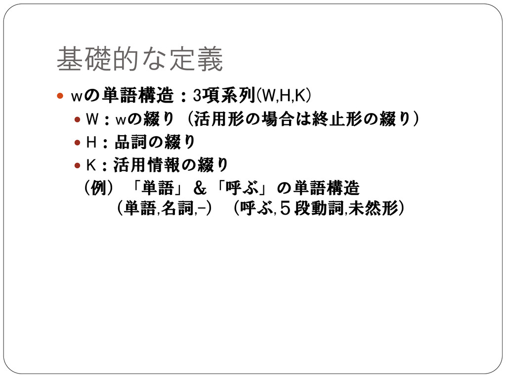 基礎的な定義 wの単語構造:3項系列(W,H,K) W:wの綴り(活用形の場合は終止形の綴り) H:品詞の綴り K:活用情報の綴り (例)「単語」&「呼ぶ」の単語構造