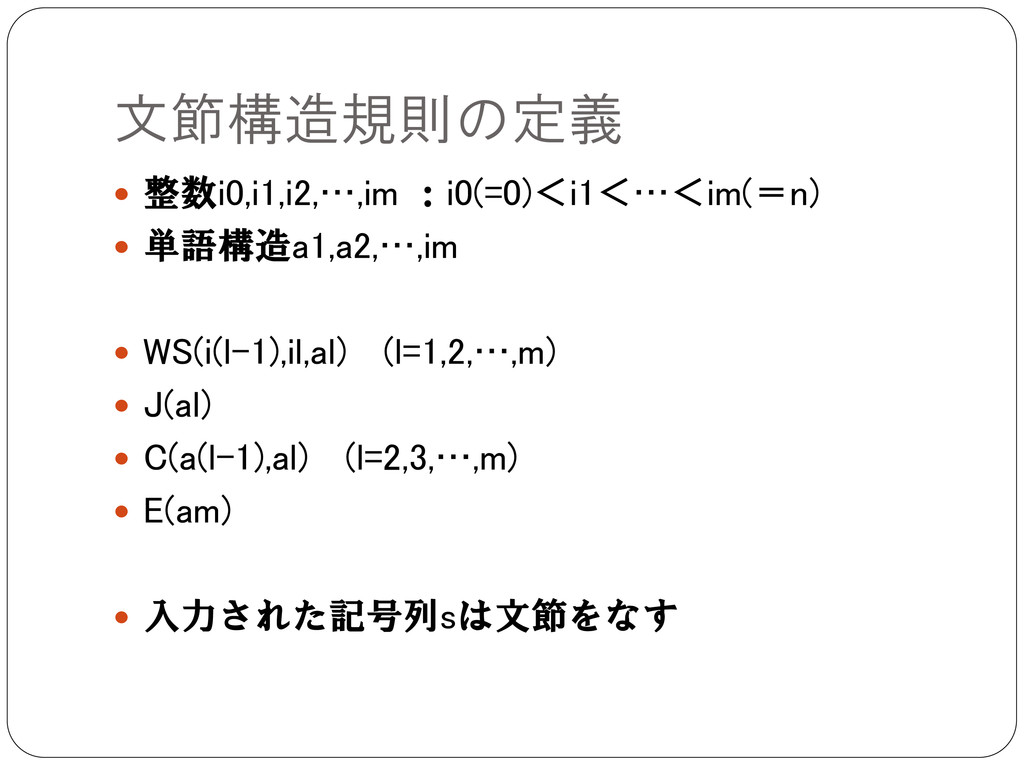 文節構造規則の定義 整数i0,i1,i2,…,im :i0(=0)<i1<…<im(=n) 単語構造a1,a2,…,im WS(i(l-1),il,al) (l=1,2,…,m)