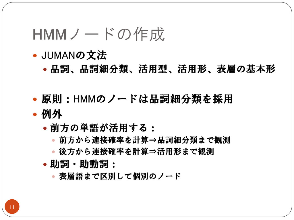 HMMノードの作成 11 JUMANの文法 品詞、品詞細分類、活用型、活用形、表層の基本形 原則:HMMのノードは品詞細分類を採用 例外