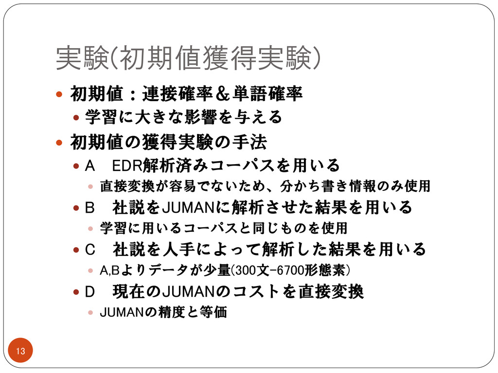実験(初期値獲得実験) 13 初期値:連接確率&単語確率 学習に大きな影響を与える 初期値の獲得実験の手法 A
