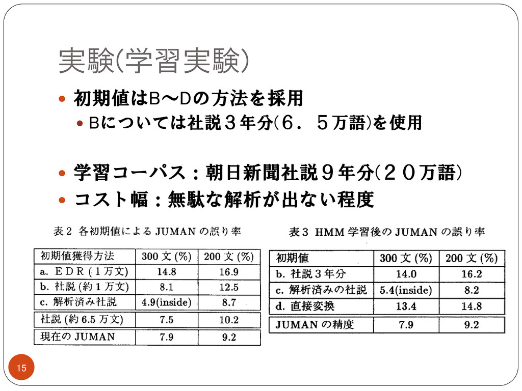 JUMANにコスト幅を許して解析 HMMで出現頻度を初期値から計算 コーパスの解析終了後、確率値を再推定