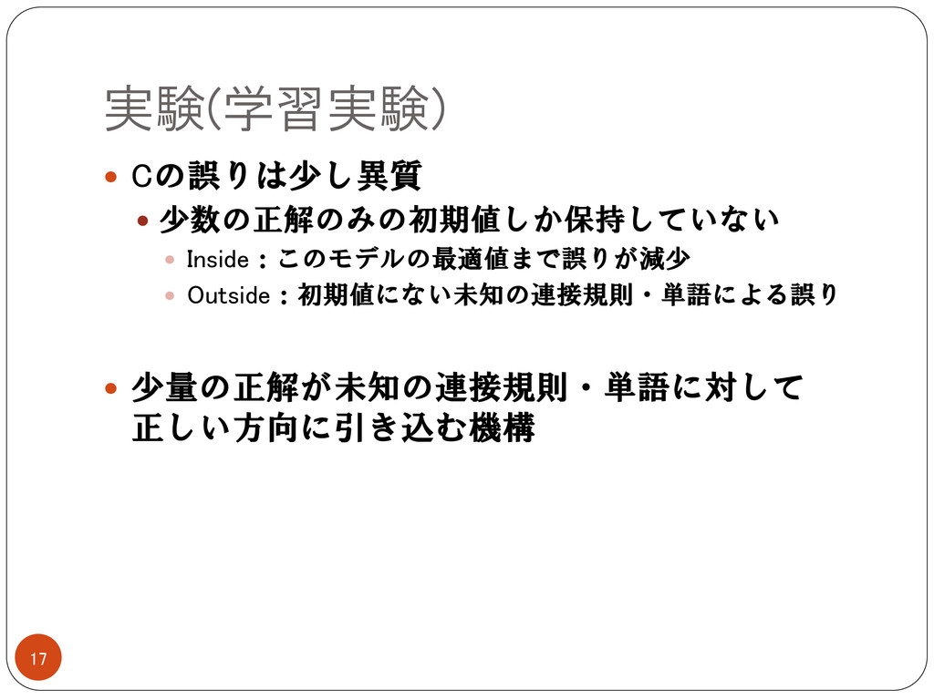 実験(学習実験) 17 Cの誤りは少し異質 少数の正解のみの初期値しか保持していない Inside:このモデルの最適値まで誤りが減少 Outside:初期値にない未知の連接規則・単語による誤り
