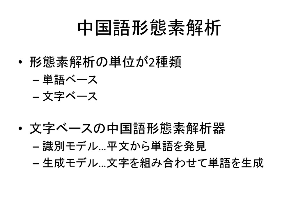 中国語形態素解析 • 形態素解析の単位が2種類 – 単語ベース – 文字ベース • 文字ベースの中国語形態素解析器 –